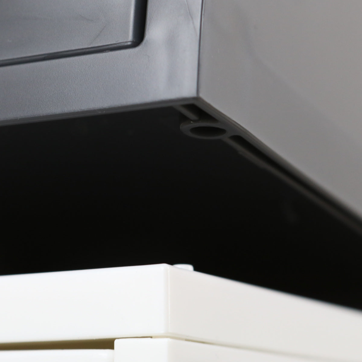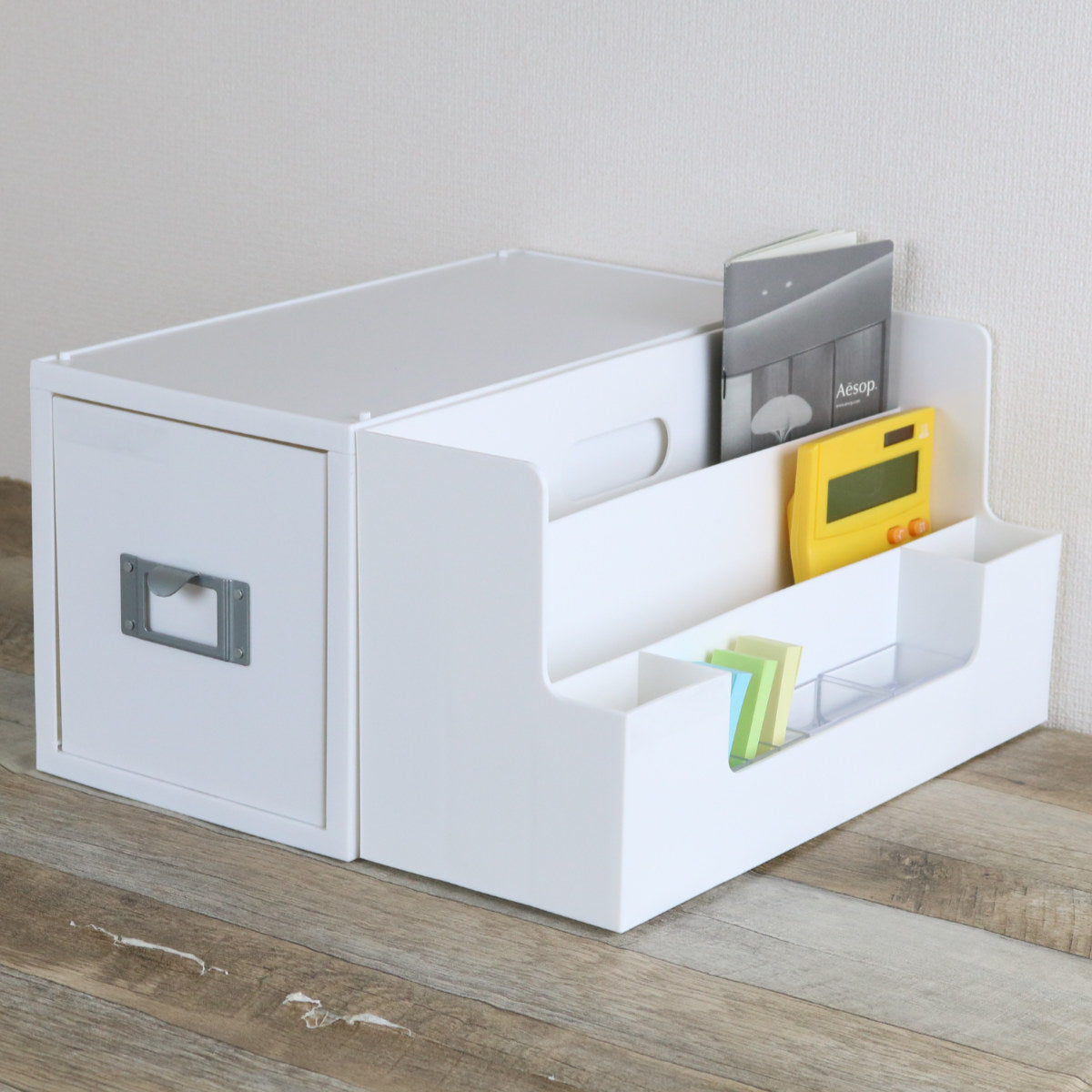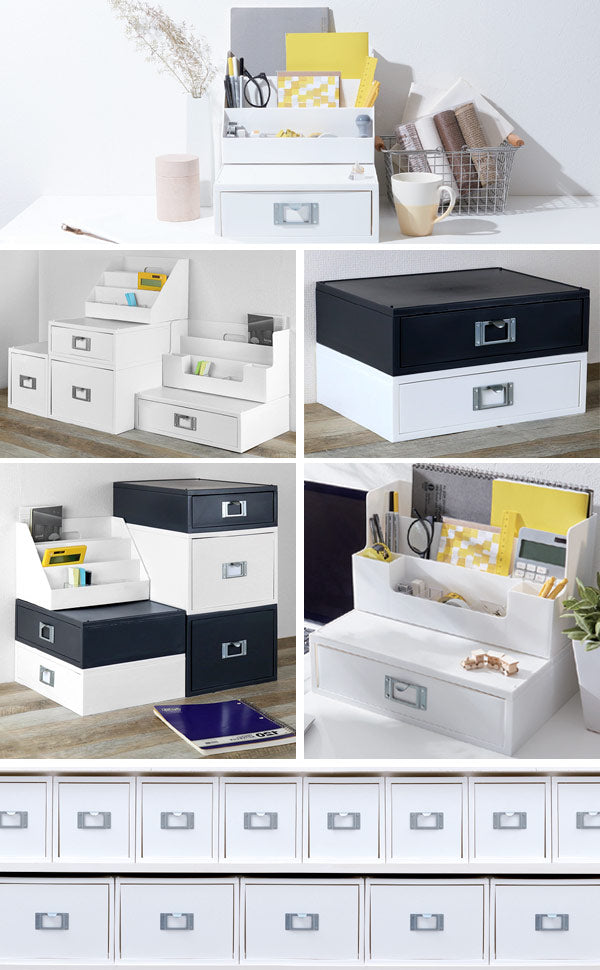 引き出しを抜いて天板を外し、上段をジョイントさせます。上段の底面には溝があるので、天板を外した下段のパーツがパチッとはまり安定感があります。ジョイント後、再び取り外すこともできます。