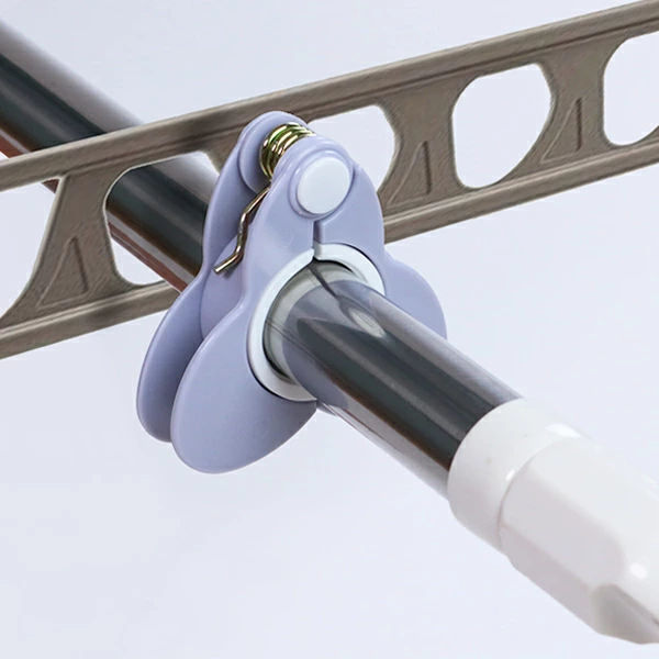 風等による物干し竿の移動・落下を防ぐ、竿ホルダーです。強力バネが入っているので竿にしっかり固定できます。物干し竿の竿受けの両外側にセットするだけで、風などによる竿の移動・落下を防ぎます。