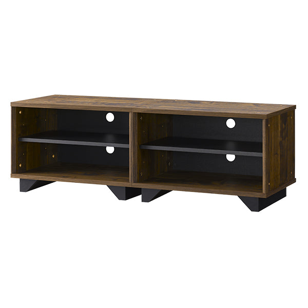 印象的な濃い木目のデザインに、脚や棚板などのパーツをブラックで引き締めたインダストリアル調のテレビボードです。