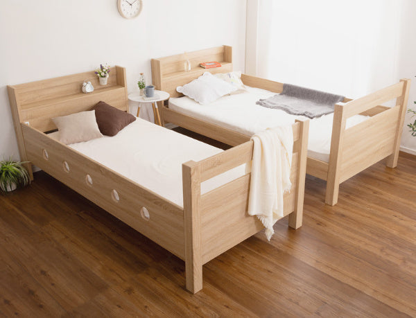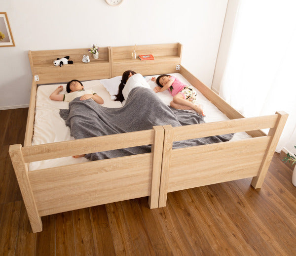 上下のベッドを分割して、2台を並べて置けばキングサイズのベッドになります。親子で十分寝られる広さなので最初はファミリーベッドとして。お子様が一人寝できるようになれば、合体させて二段ベッドに。成長すればそれぞれの部屋に分けてシングルベッドとしてお使いいただけます。家族の成長や、ライフスタイルに合わせて変化させられるベッドです。