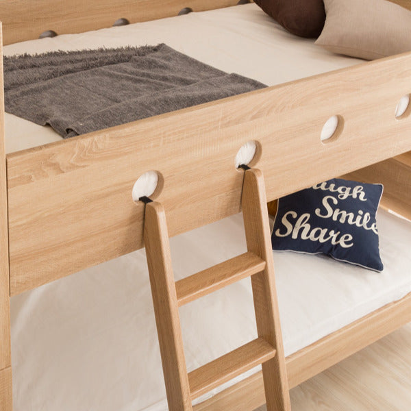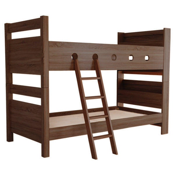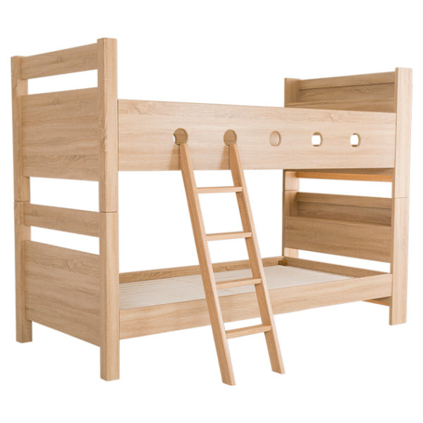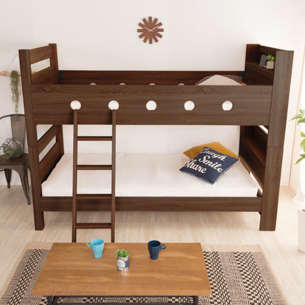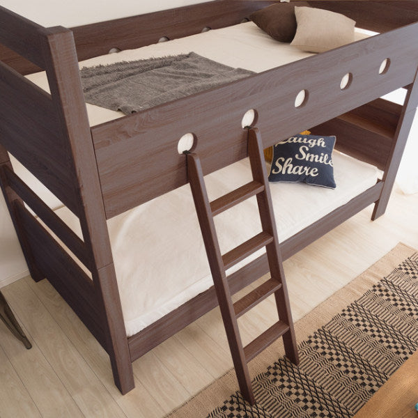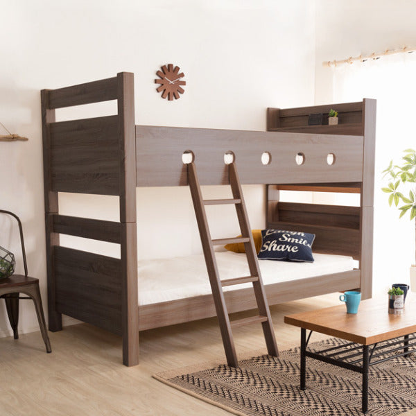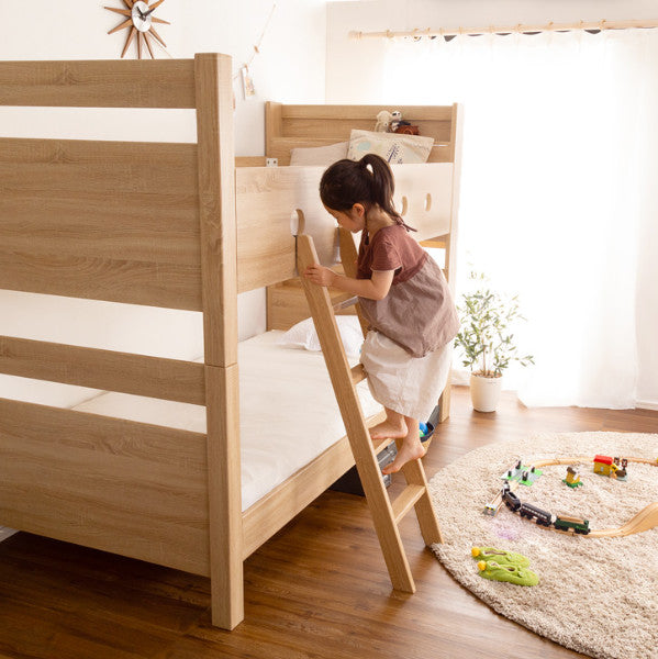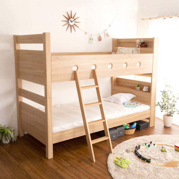 本物の木のような質感を表現した、温かみのある木製ベッドは子供だけでなく、大人も使えるシンプルデザインです。省スペースで置ける二段ベッドは、子供部屋の他にも学生寮や社員寮、シェアハウスや民泊など様々な場所で活躍します。