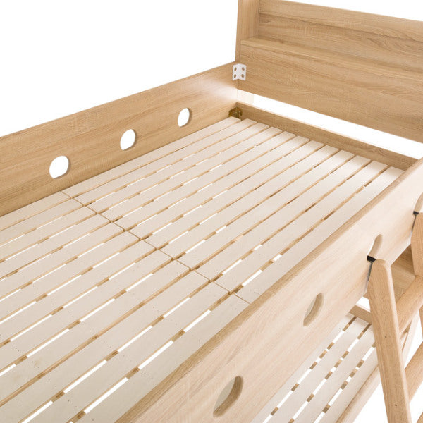 ベッドの横板に空いている穴の好きな位置でハシゴが引っかけられるようになっています。ハシゴをかける部分はフラットにカットされているので、ハシゴが安定します。踏板部分は幅6cmと広く足元が安定するので、昇り降りも安心です。