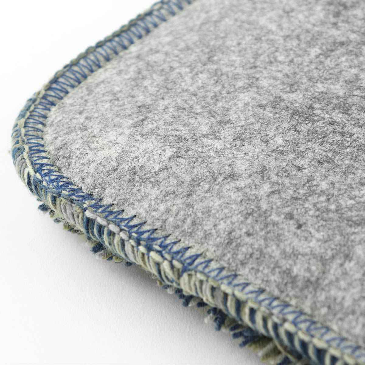 裏面はフェルト生地で椅子や床に置いた時に滑りにくくなっています。布端は丁寧に処理してあるので、ほつれを防止して長く使っていただけます。