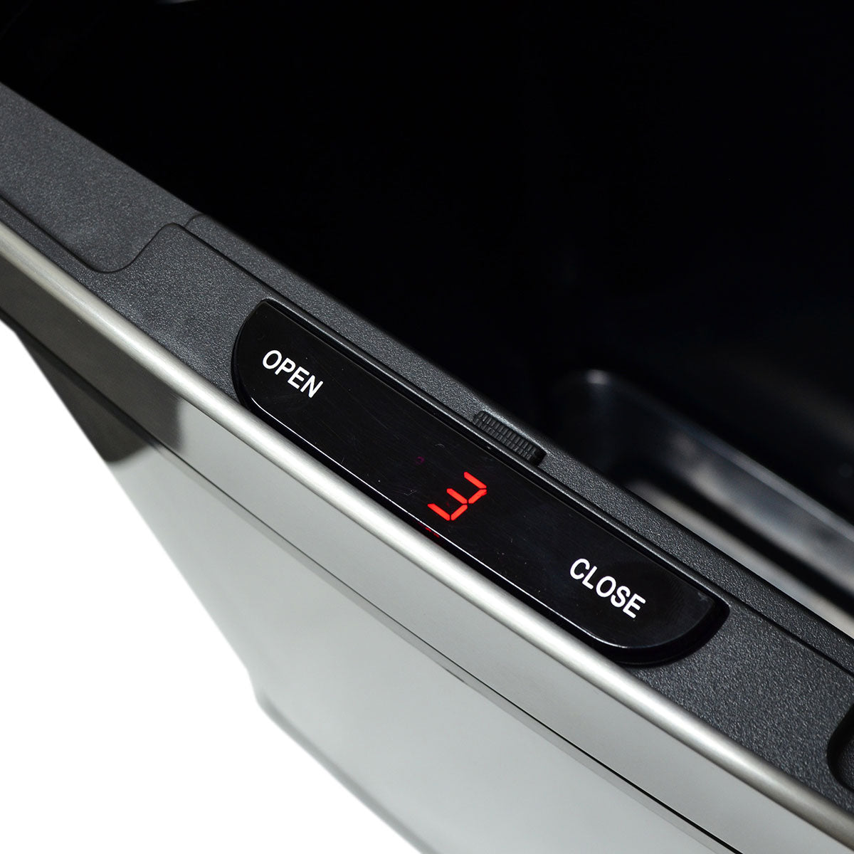 自動センサー機能付きで手をかざすだけでフタが開きます。不要な接触を控えることができるため衛生的です。5秒間のカウントダウンを表示し、その後自動で閉まります。