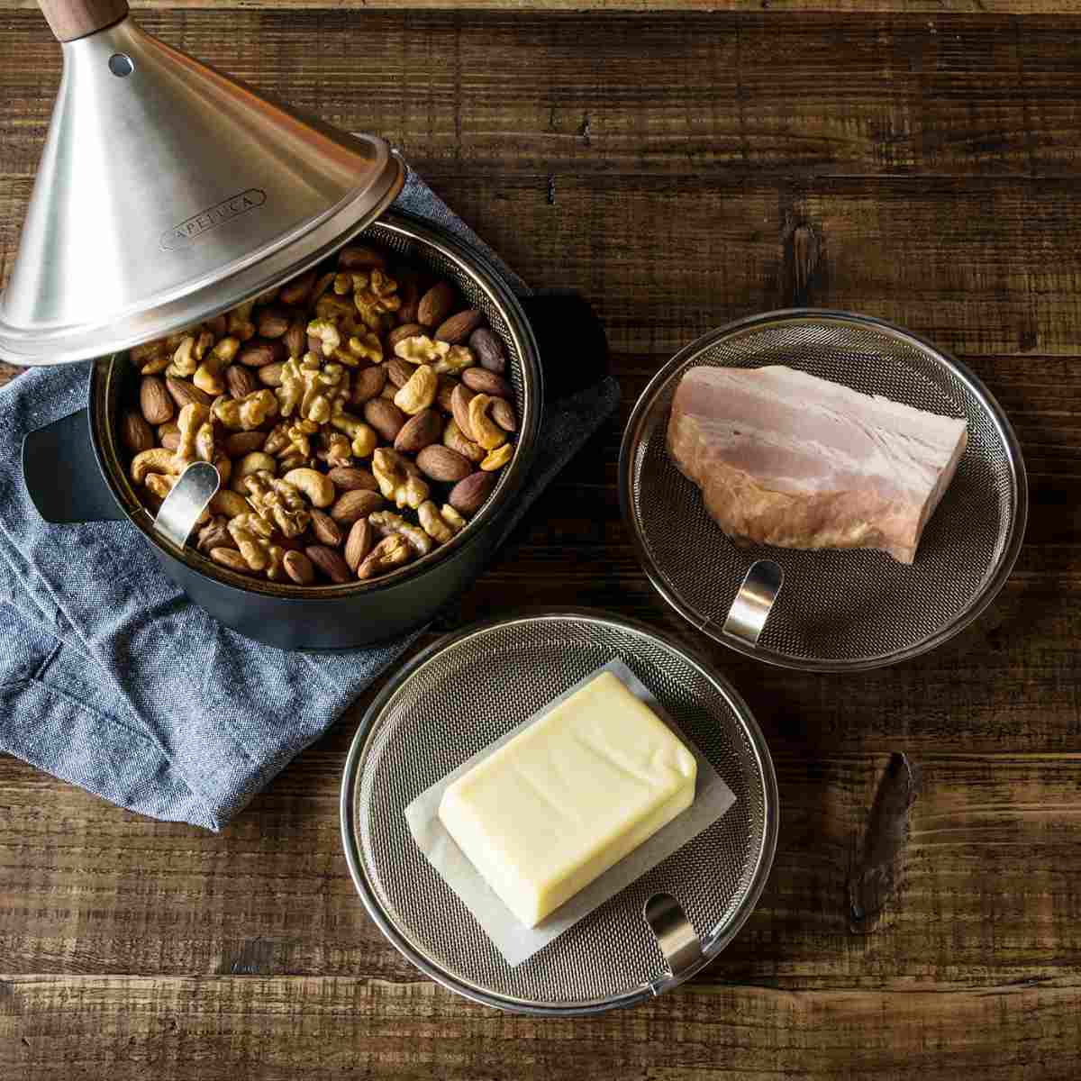 アペルカテーブルトップスモーカー専用のメッシュトレーです。次にスモークする食材をスタンバイしておけば続けて燻製できます。下ごしらえの食材の自然乾燥にも使えます。