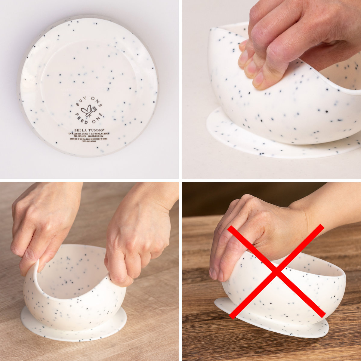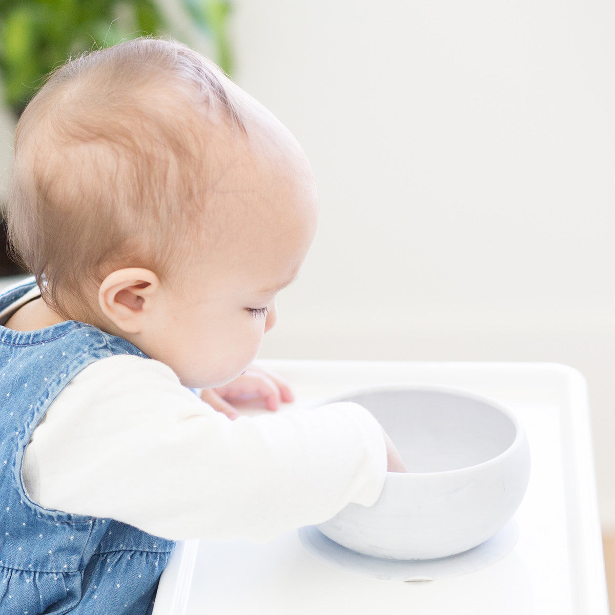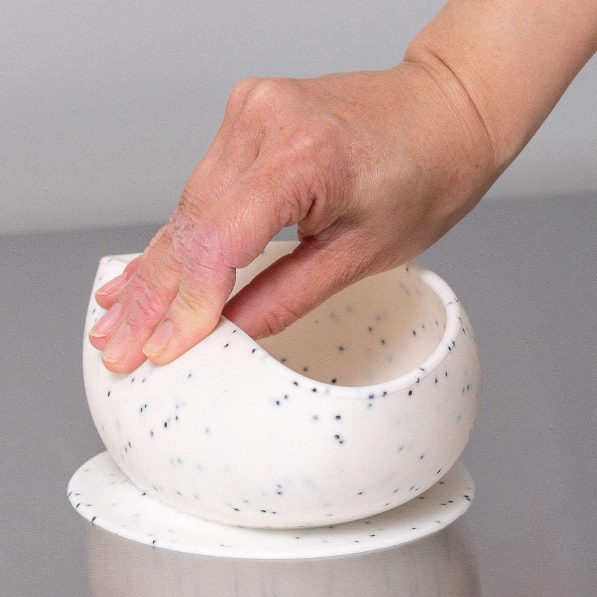 ボウルの裏面に吸盤が付いており、テーブルにしっかりとくっつくので赤ちゃんが掴んでひっくり返す心配がありません。シリコーンゴム製のボウルなので、万が一落としても放り投げられても、割れることなく安心してお使いいただけます。