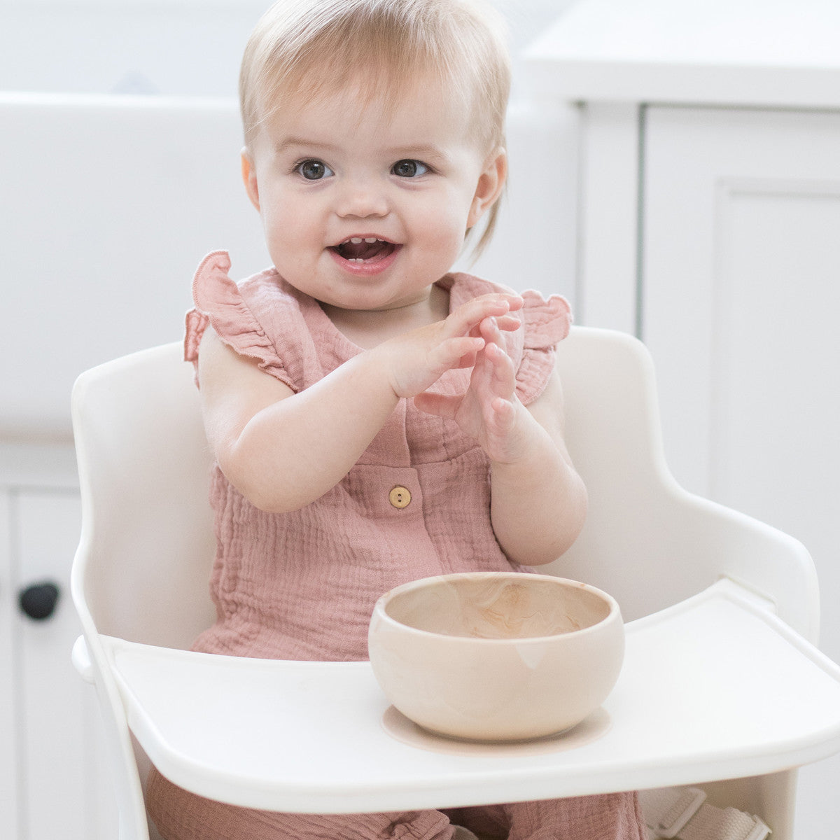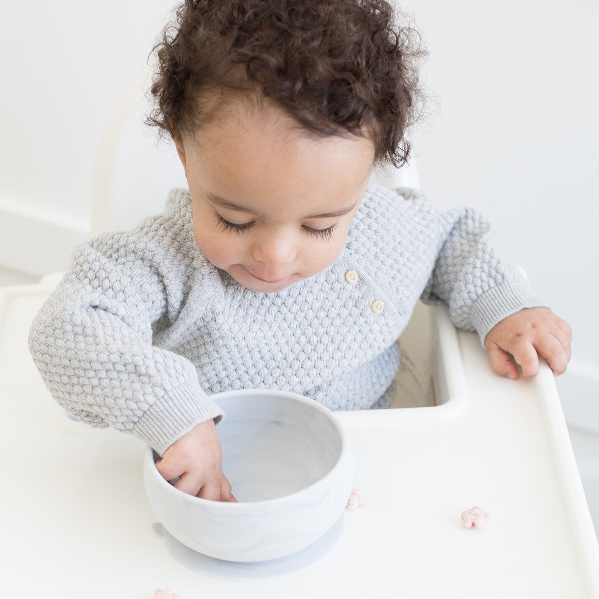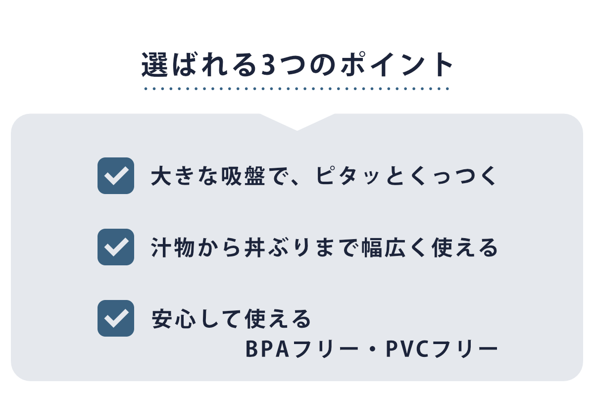ボウルの裏面に吸盤が付いており、テーブルにしっかりとくっつくので赤ちゃんが掴んでひっくり返す心配がありません。シリコーンゴム製のボウルなので、万が一落としても放り投げられても、割れることなく安心してお使いいただけます。
