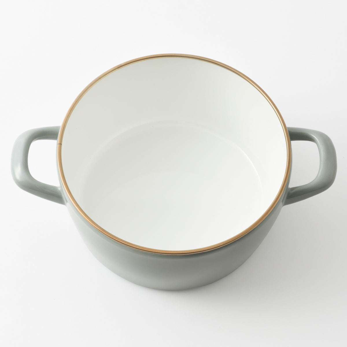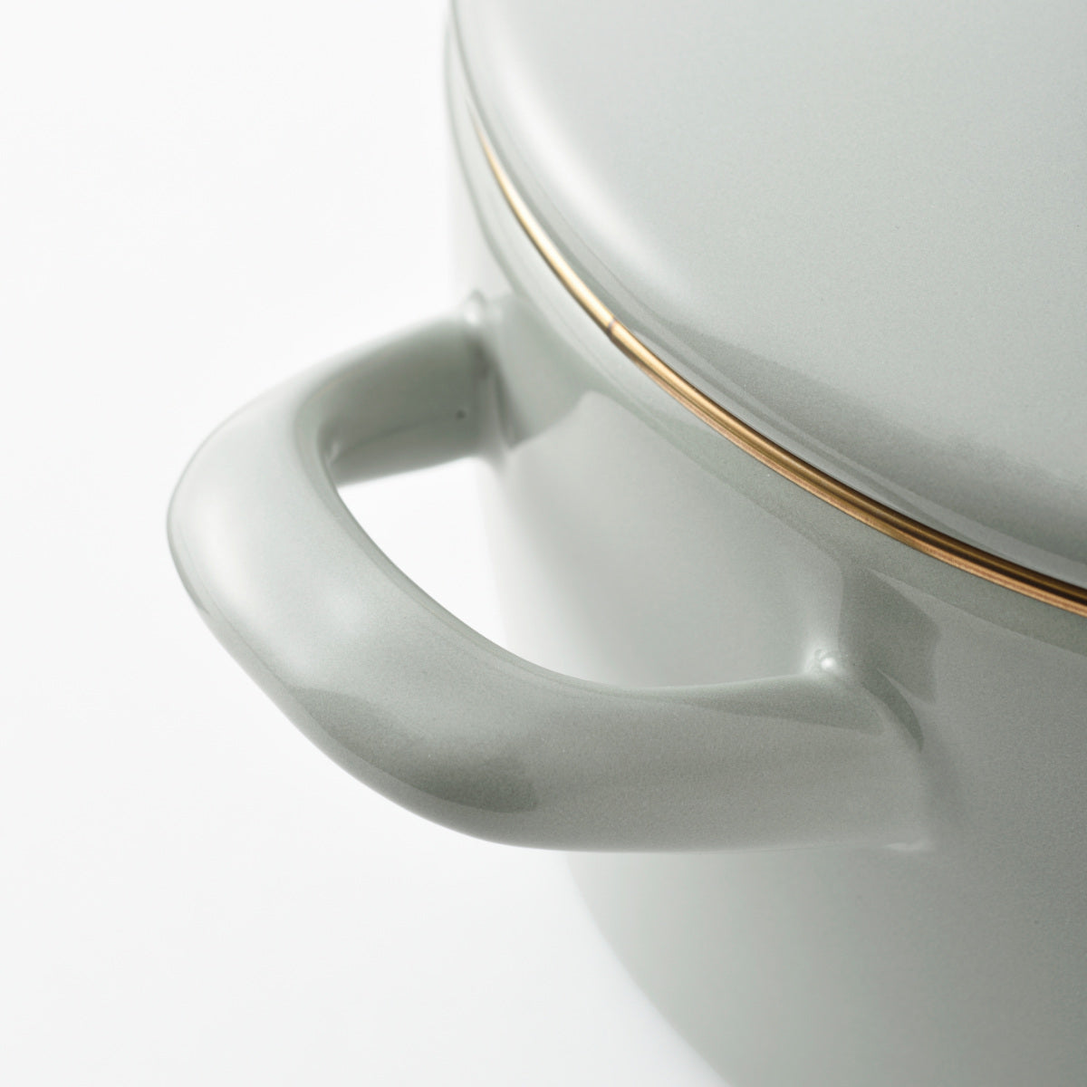 ホーロー製品は手作業で釉薬(ゆうやく)をかけるため、縁や裏側に塗りムラが起こります。また、焼成の際に吊るして炉に入れるため、縁や取っ手の裏側に金具の跡が残る場合があります。