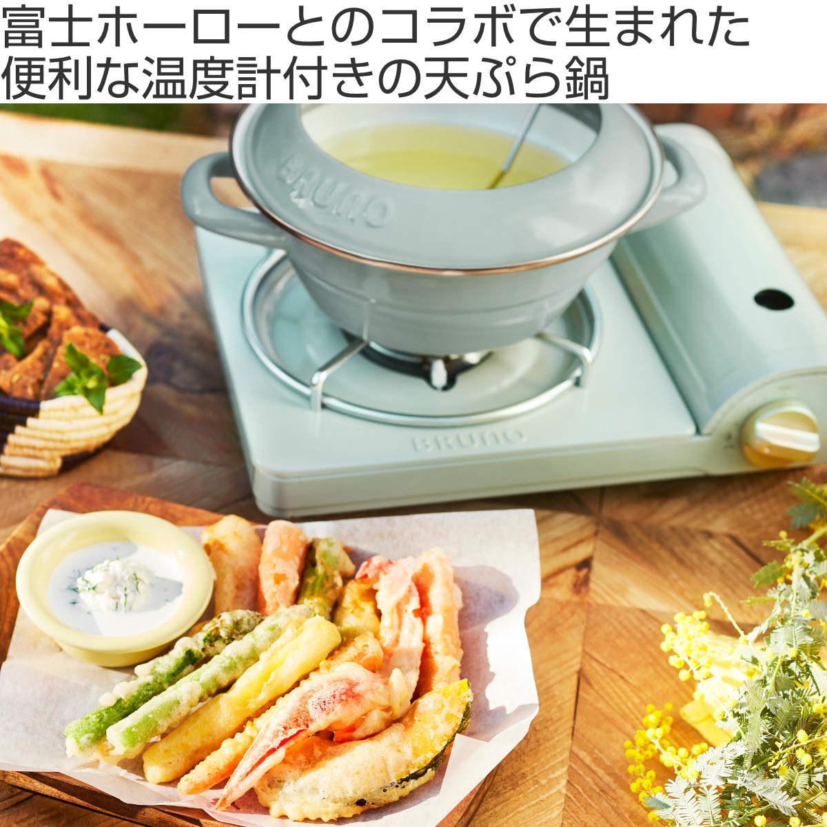 BRUNOと富士ホーローのコラボで生まれた、二度揚げにも便利な温度計付きの天ぷら鍋です。2~3人分の揚げ物の調理に適したサイズで、ガス火でもIH調理器でも熱効率よく調理できます。熱伝導のいいホーロー製なので、油の温度上昇が早く、揚げ物をカラッと揚げることができます。