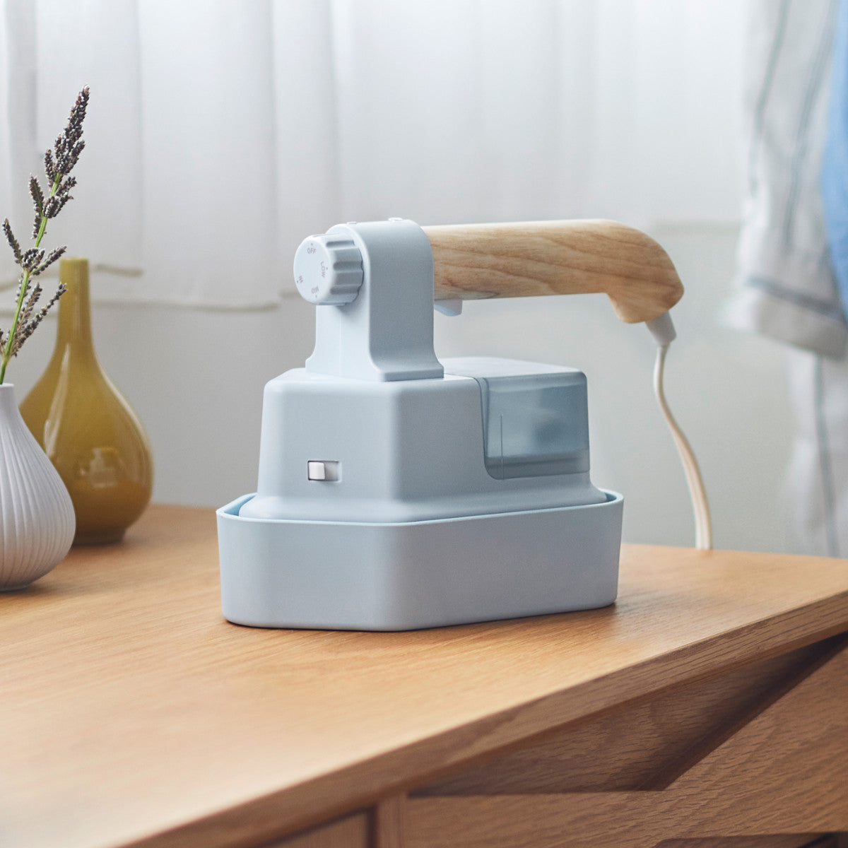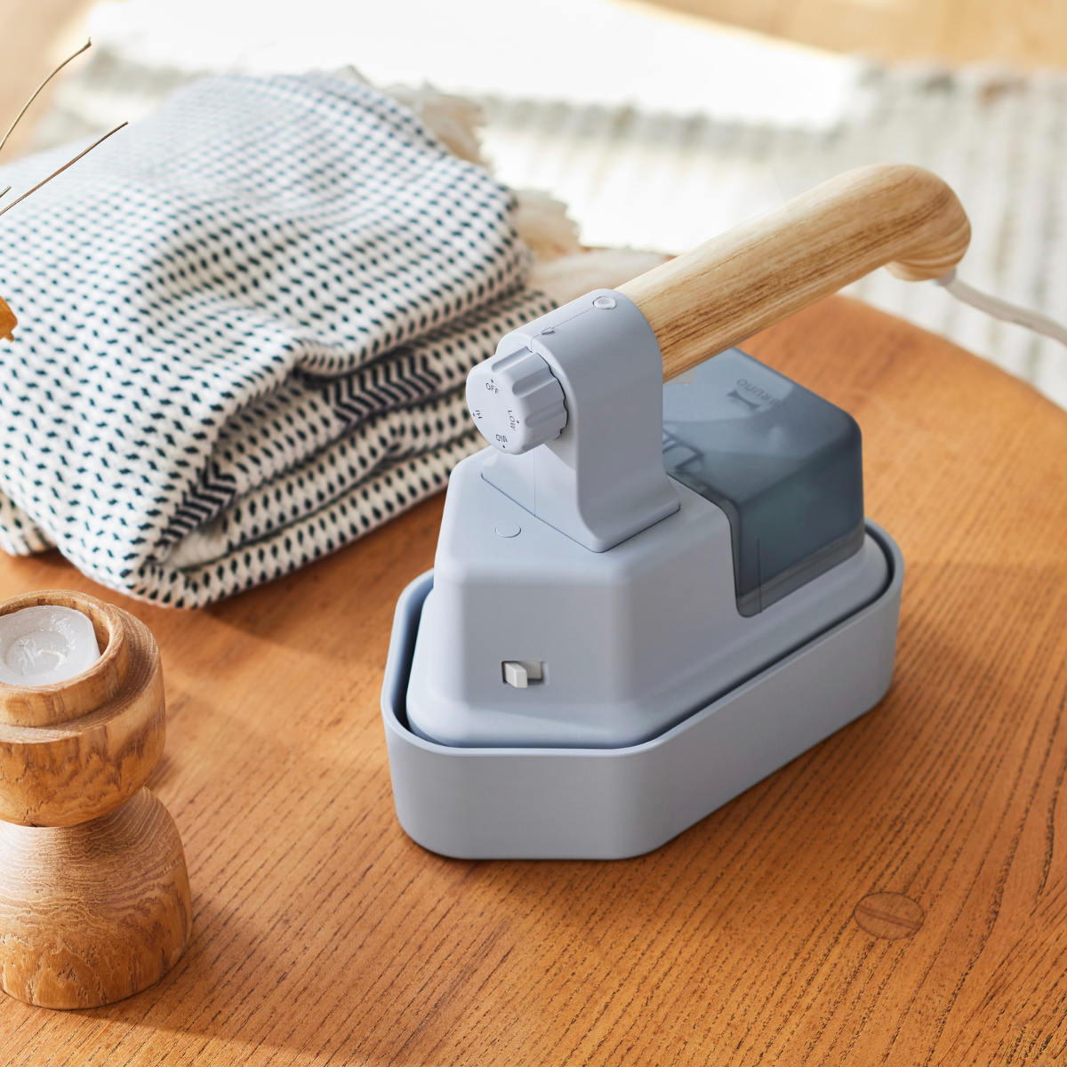 気になるシワを手早く伸ばせる2way衣類スチーマーです。プレスでしっかりシワを伸ばしたい時も、お出かけ前にサッとスチームで衣類ケアするのにも便利なアイテムです。約25秒とスピーディーに立ち上がるので、忙しい朝の準備に最適です。昔ながらのアイロンをイメージしたデザインと木目調の持ち手で、どんなインテリアにも馴染みます。