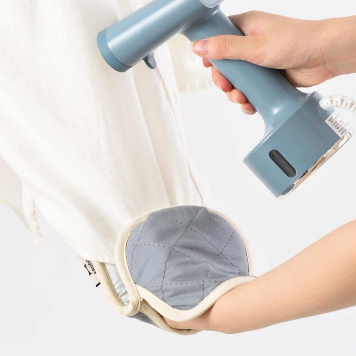 忙しい時でもアイロン台を出さずにシワ伸ばしがサポート出来るアイロンミトンです。手にはめるだけで手軽にアイロン掛けが出来ます。袖口の仕上げやボタンまわりや襟元など、ケアしたいところに合わせて使える便利アイテムです。アイロン台を使う必要がないので、お出かけ前の時間がない時に便利です。