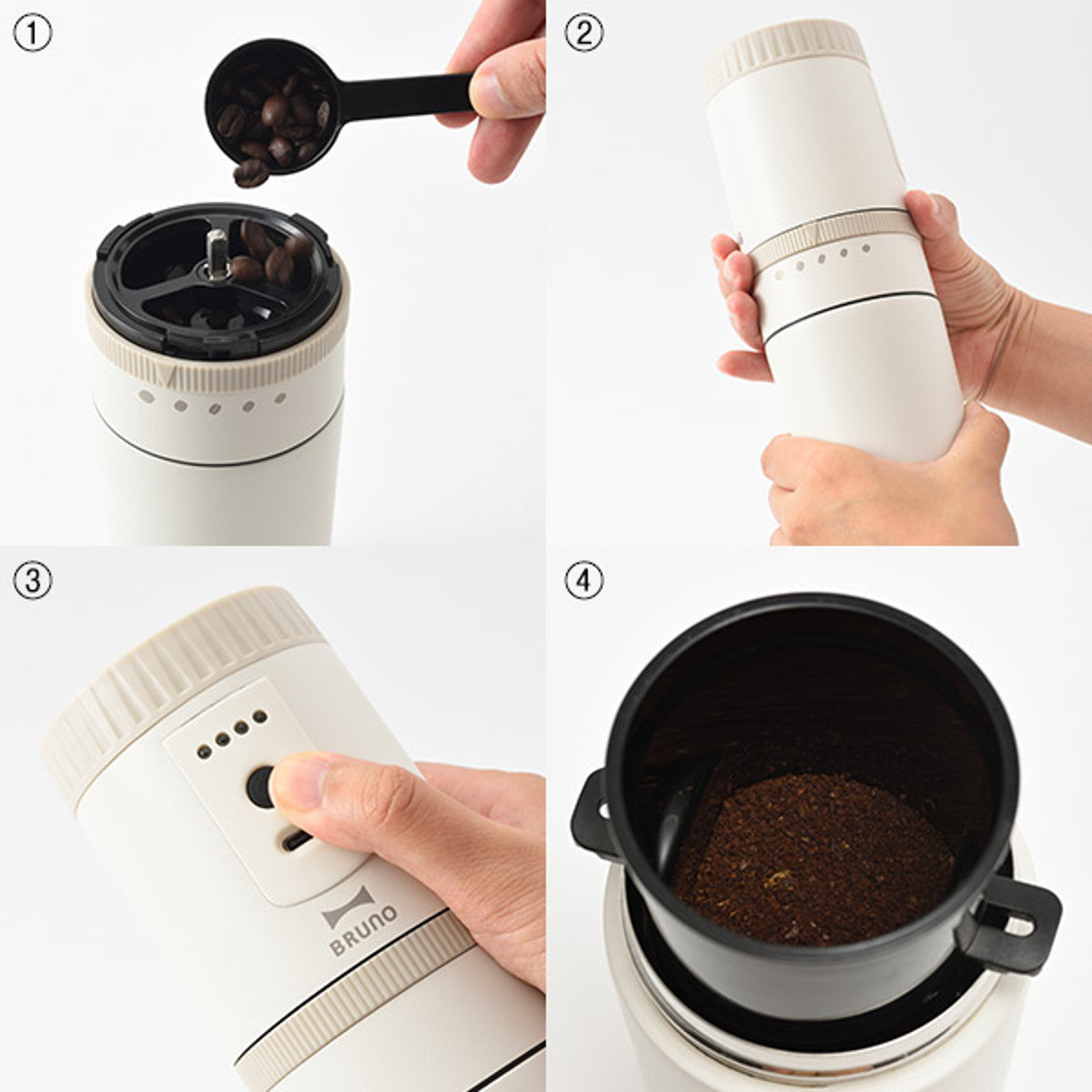 備考 | [機能] ・挽き目5段階調整 ・真空二重構造 ・ ・自動停止機能 ・連続使用回数:約15回 [電源]リチウムイオン蓄電池 7.4V 800mAh [入力]DC5V 1A Max.(USB充電式) [充電時間]約4時間(入力 5V 1Aの場合) ※重量は商品の特性上、多少の誤差があります ※お客様のお使いのモニター設定、お部屋の照明等により色味が実際と異なる場合があります |