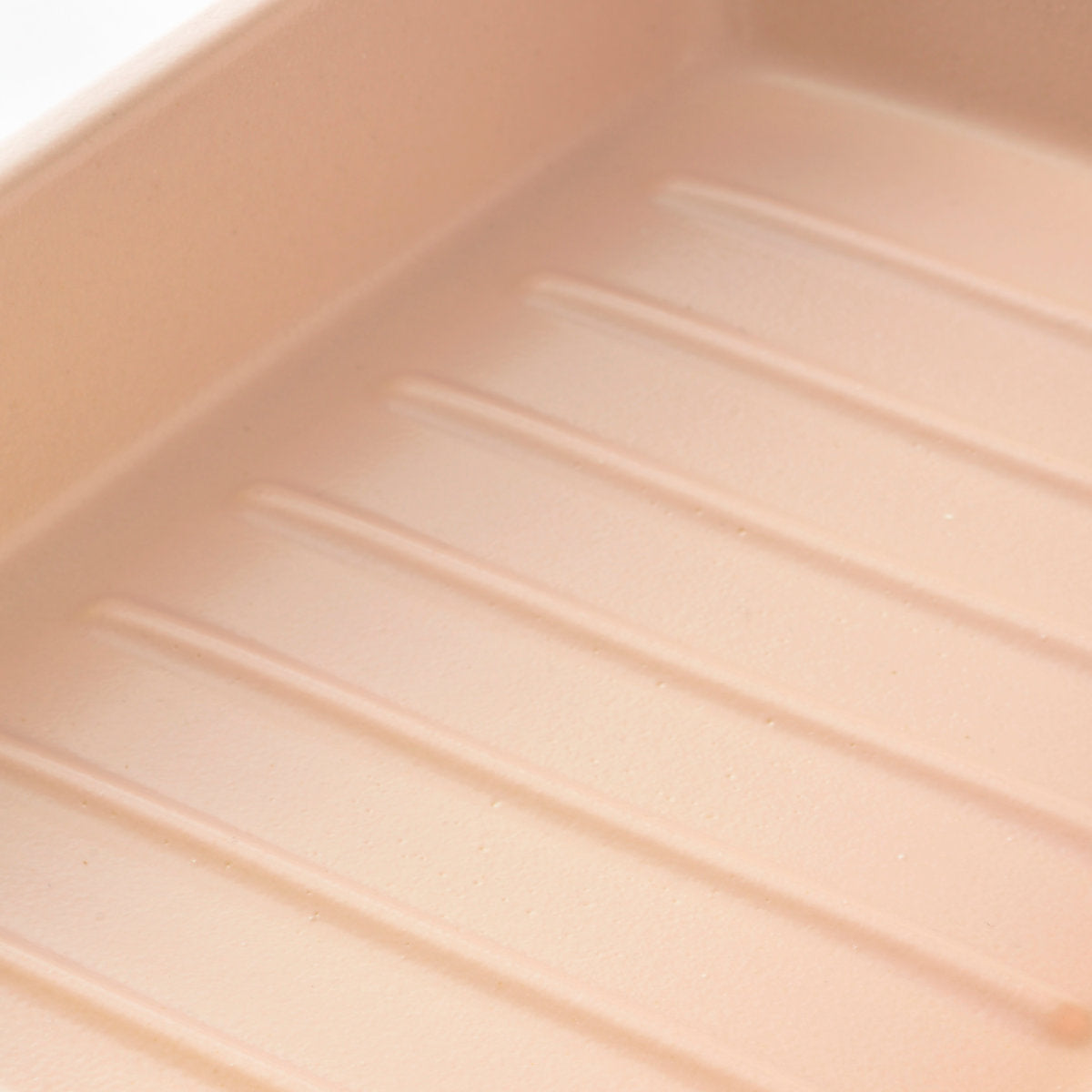 底面の凹凸でヘルシー調理 底面に凹凸があるプレートなので、肉や魚の余分な脂を落とし、ヘルシーに仕上がります。 |