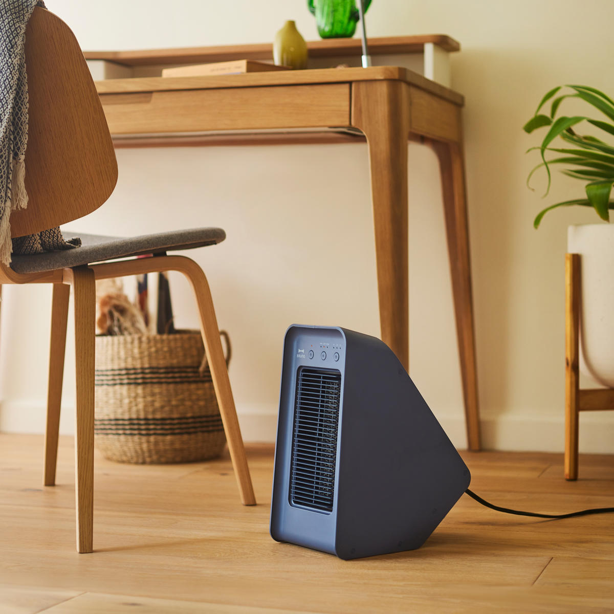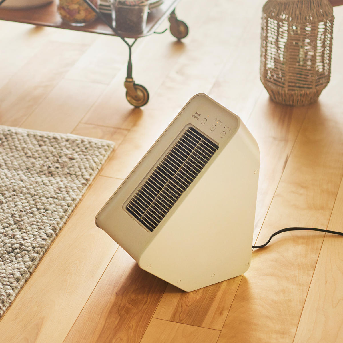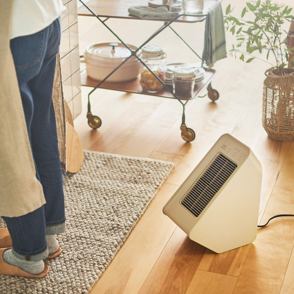 置き方で「5度」と「45度」の2つの送風角度を切り替えできるファンヒーターです。デスクやワークスペースの足元で使う時は「5度」の角度に、キッチンや脱衣所では「45度」の角度で上向きにするなど、シーンに合わせてお使いいただけます。シンプルでコンパクトなデザインでお部屋に馴染みやすいです。
