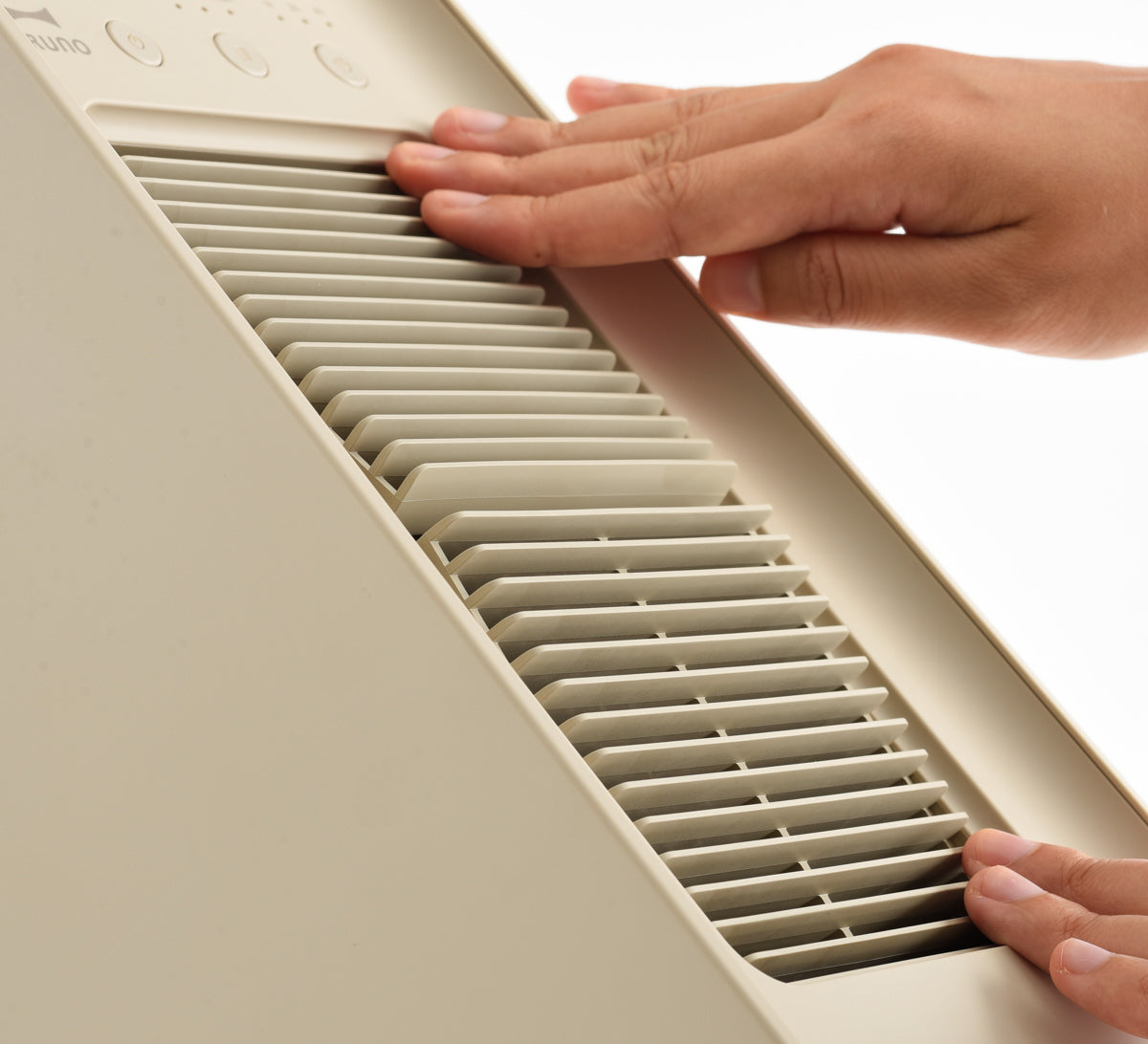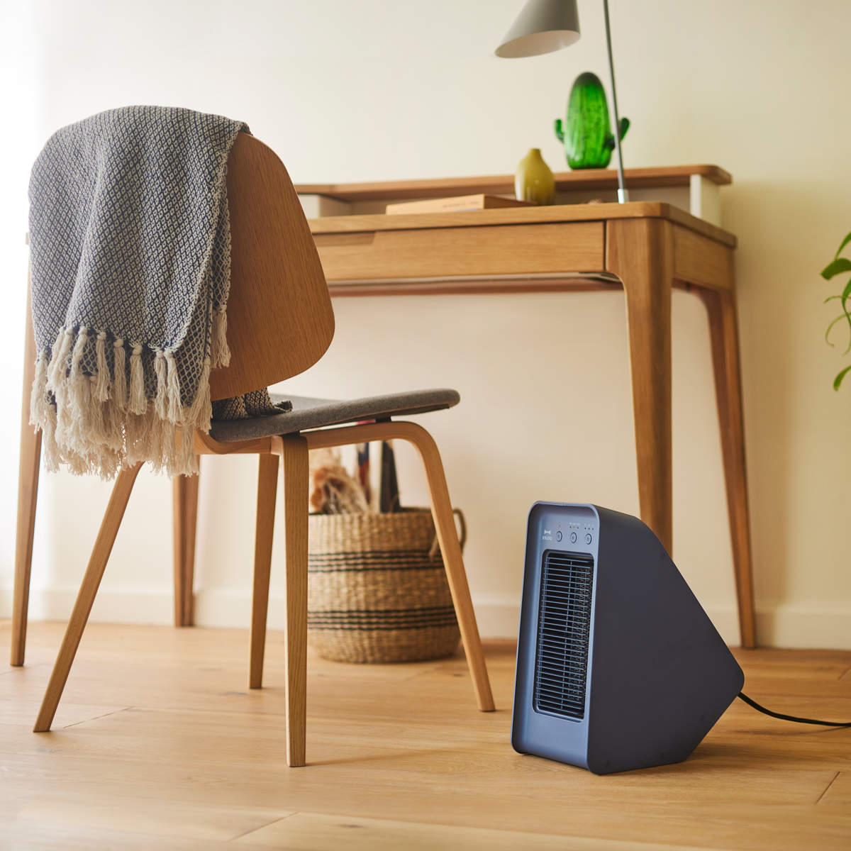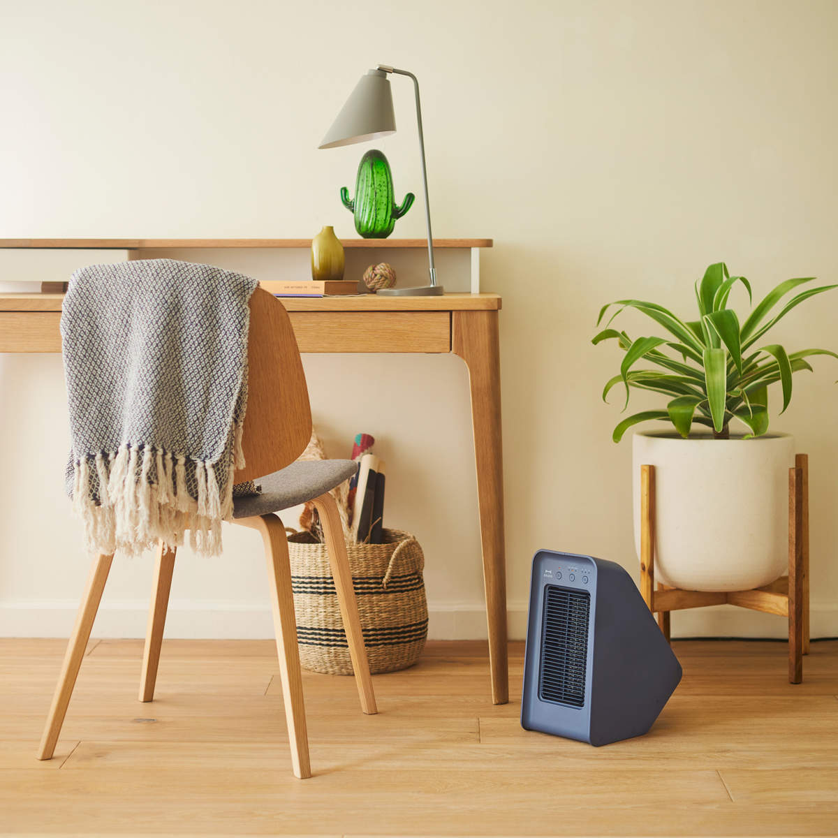 置き方で「5度」と「45度」の2つの送風角度を切り替えできるファンヒーターです。デスクやワークスペースの足元で使う時は「5度」の角度に、キッチンや脱衣所では「45度」の角度で上向きにするなど、シーンに合わせてお使いいただけます。シンプルでコンパクトなデザインでお部屋に馴染みやすいです。