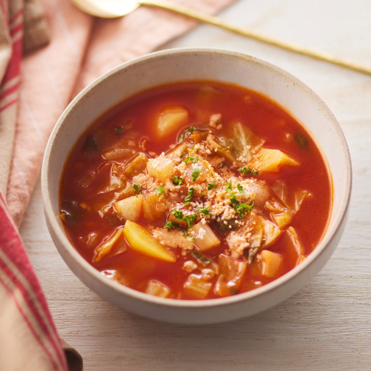 ごろごろ具材で食べ応え抜群の大満足スープが出来上がります。スープジャーに移し替えたらお弁当にもぴったりです。