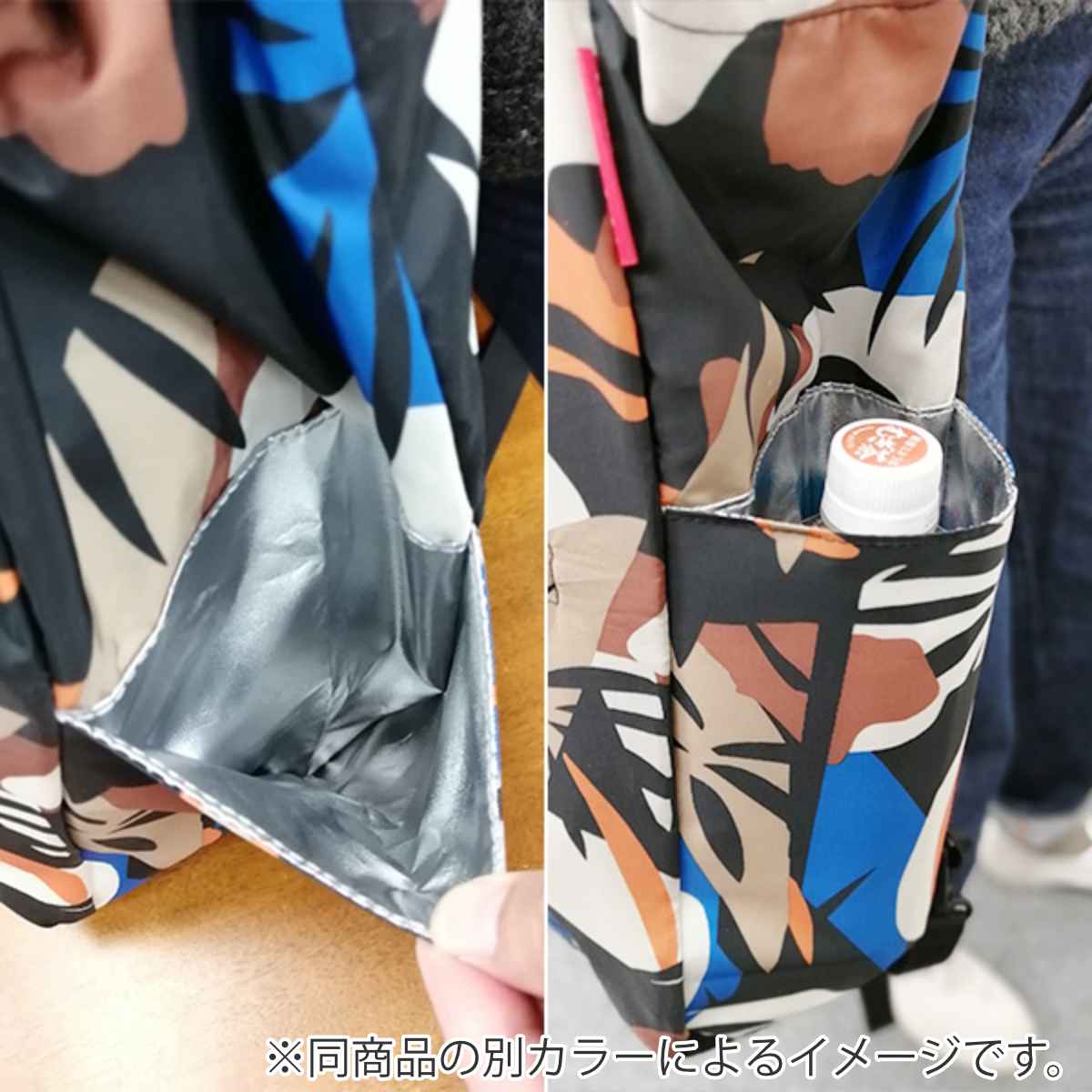 サイドポケットの片側は、保冷保温仕様になっています。水分を通しにくい素材なので、ペットボトルや濡れた折り畳み傘を収納しても大丈夫です。
