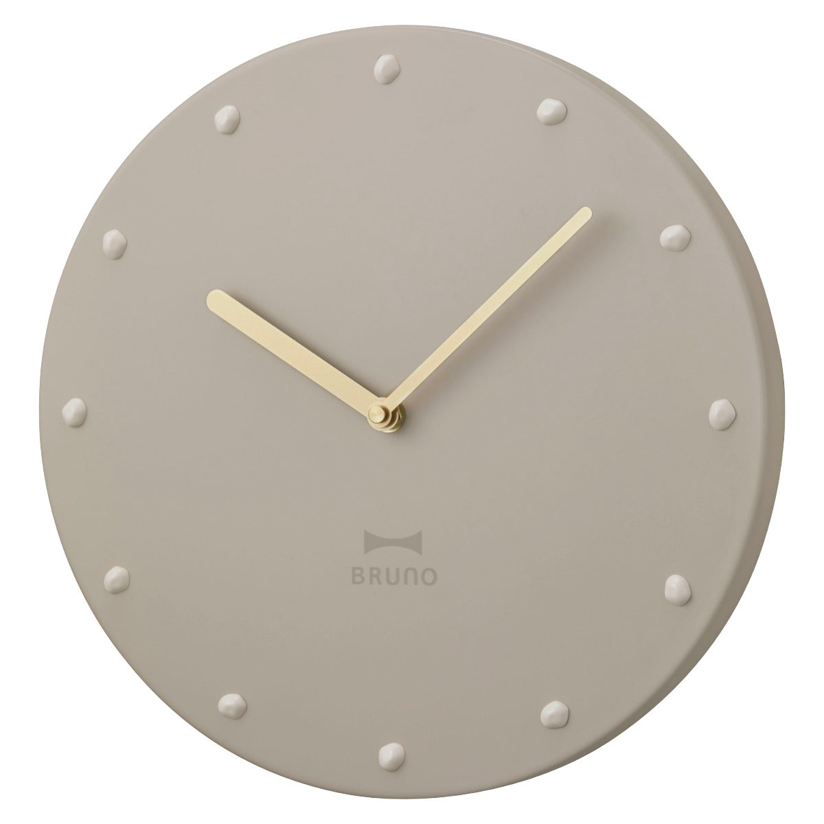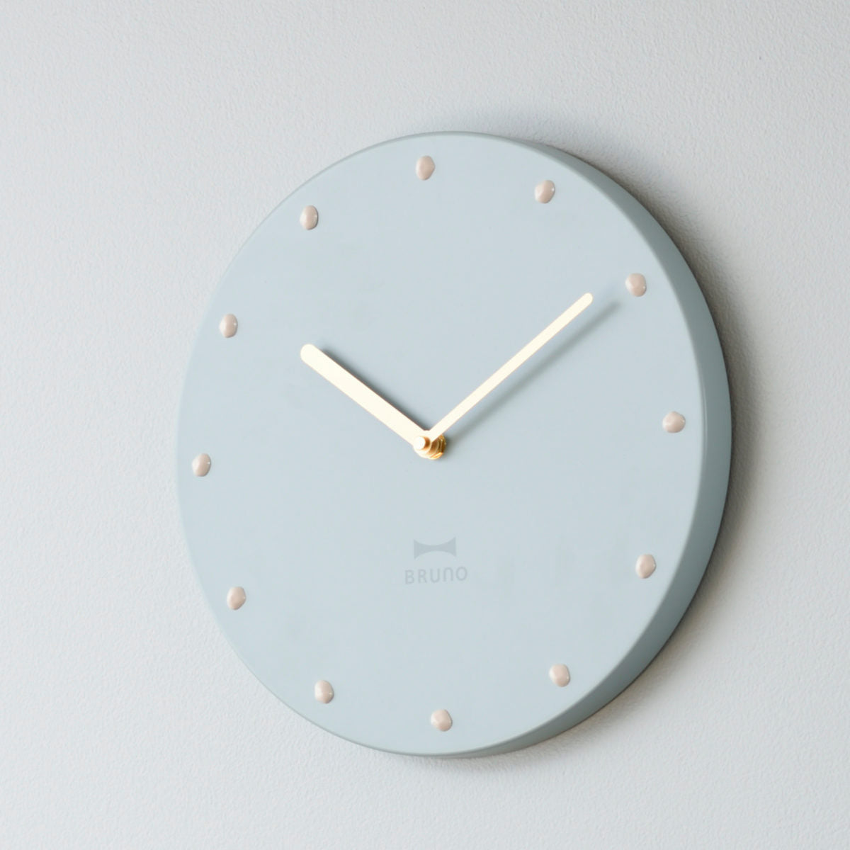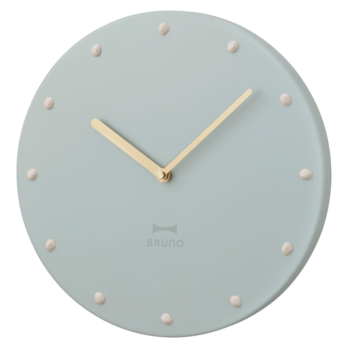 マットなくすみカラーが落ち着いた印象を与えるBRUNOの掛け時計です。ゴールドの針や重厚感のあるスチール素材、小石をモチーフにしたインデックスなど、シンプルながら存在感のあるデザインになっています。