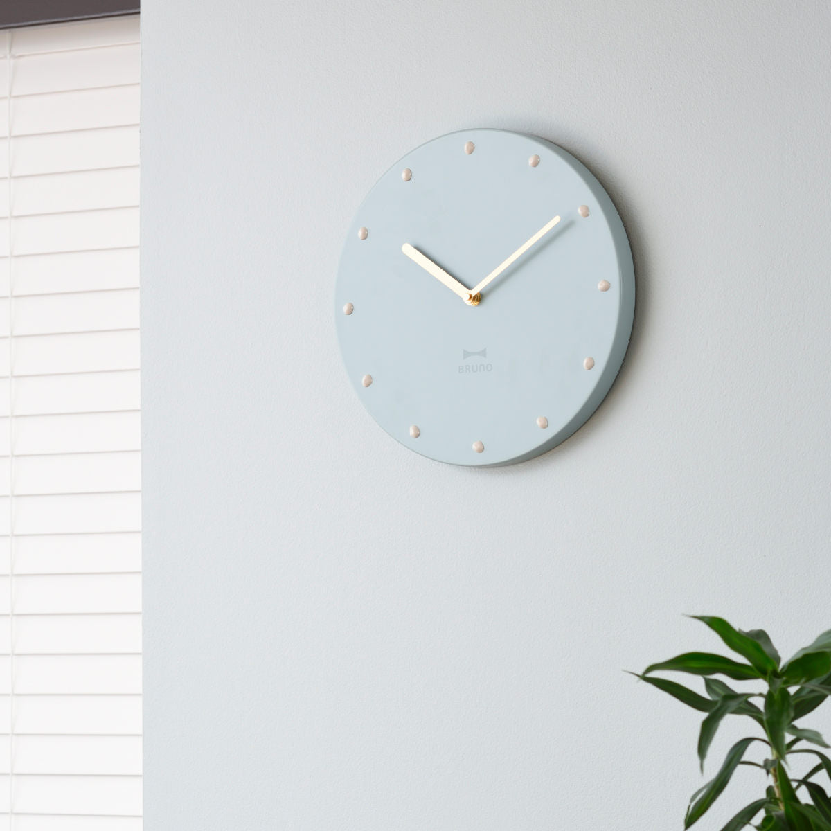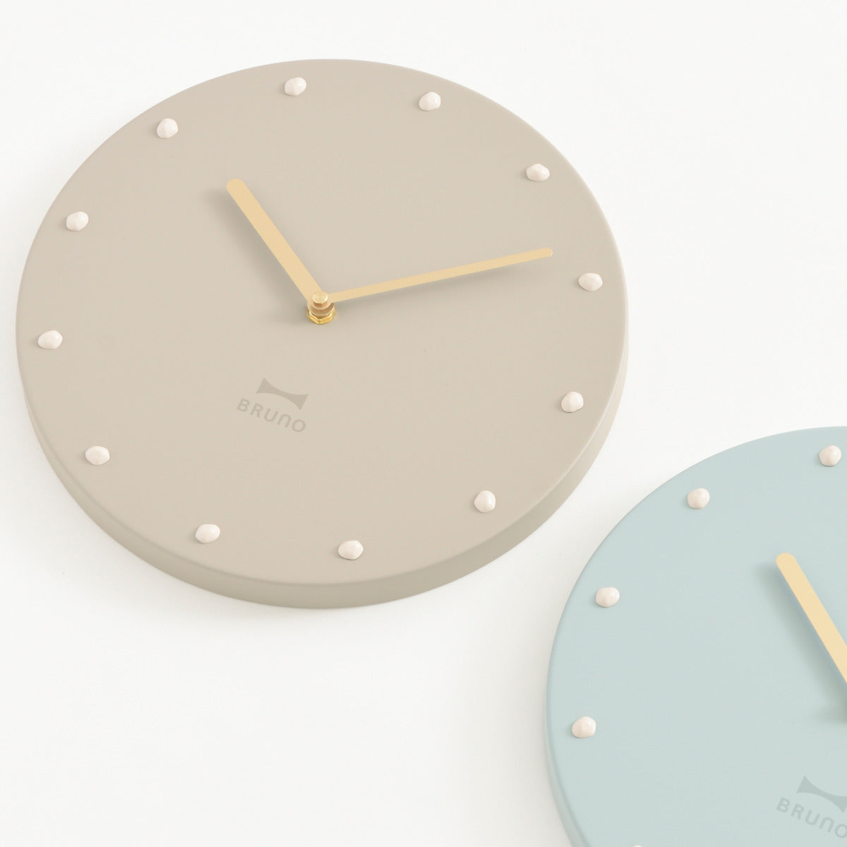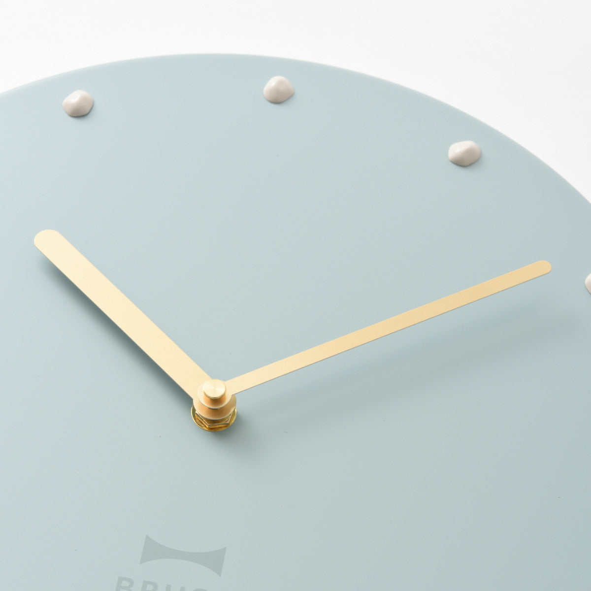 マットなくすみカラーが落ち着いた印象を与えるBRUNOの掛け時計です。ゴールドの針や重厚感のあるスチール素材、小石をモチーフにしたインデックスなど、シンプルながら存在感のあるデザインになっています。