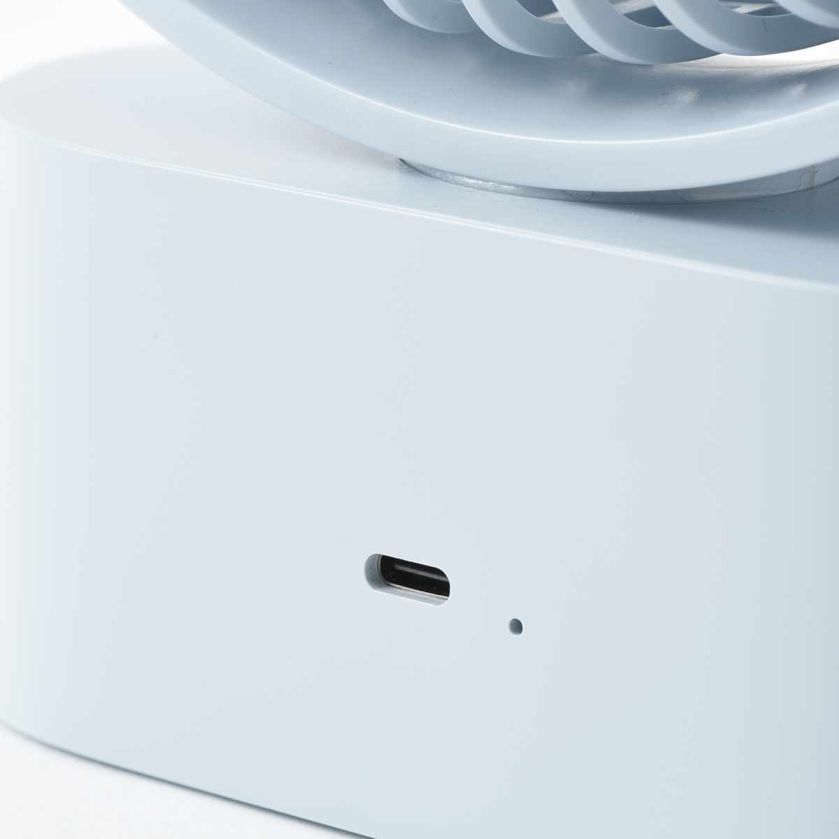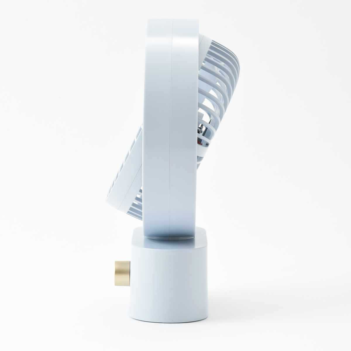 コンパクトサイズのUSB充電式扇風機です。コードレスなので、デスクはもちろん、キッチン、アウトドアなどさまざまな場所でお使いいただけます。落ち着いた雰囲気のくすみカラーとゴールドの2色の組み合わせはインテリアとしてもお洒落な雰囲気です。