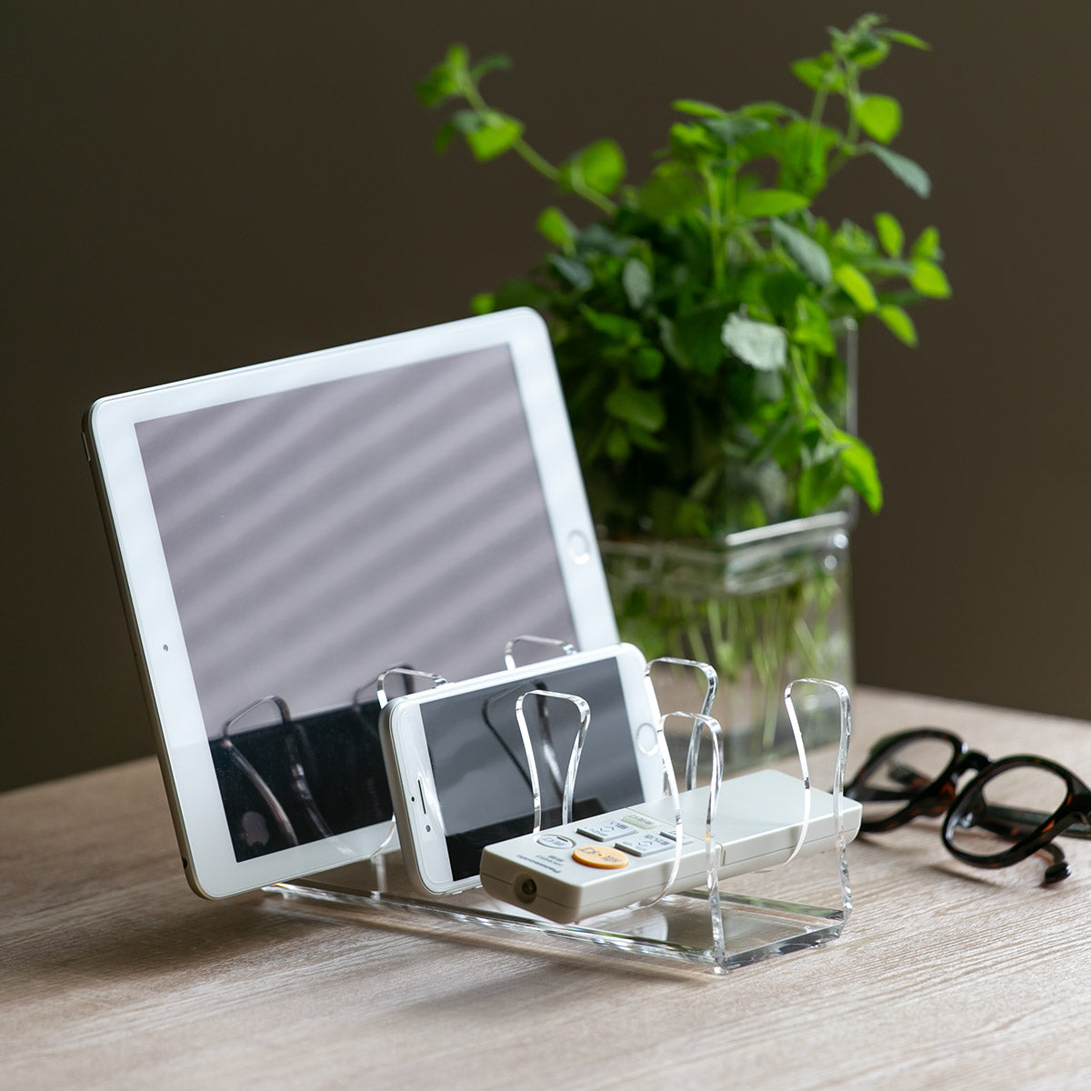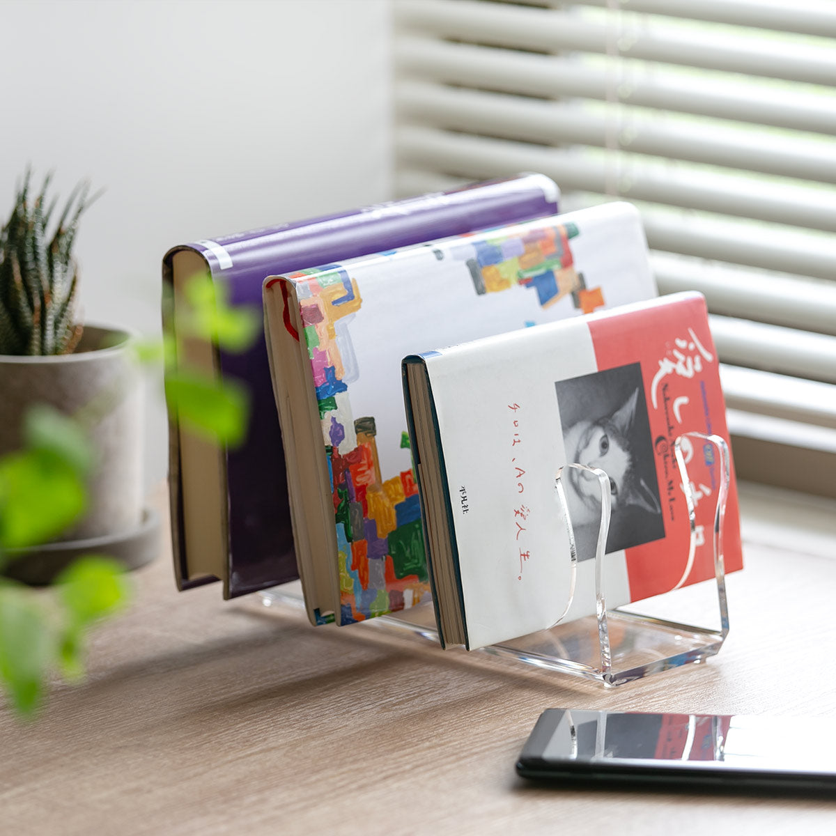 横置きで使うとリモコン以外のモノのスタンドとして利用できます。お気に入りの本を収納するブックスタンドとしてや、タブレットやスマートフォンなどのガジェット類をまとめて収納するスタンドととしてもお使いいただけます。
