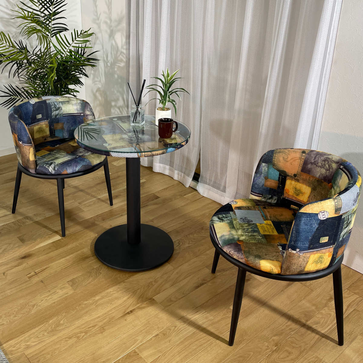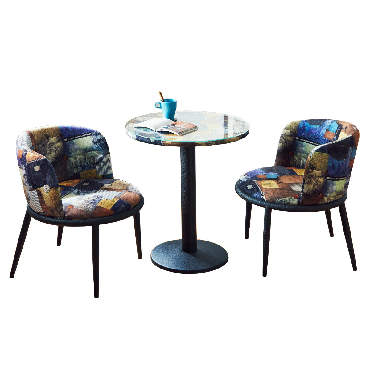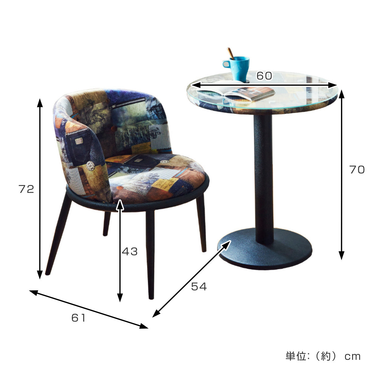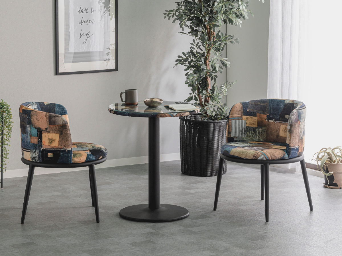 バイキャスト加工されたPVCと、個性あふれるお洒落なファブリックを使ったレトロな雰囲気のカフェテーブルセットです。置くだけでお家にホッと一息付ける場所を提供してくれます。
