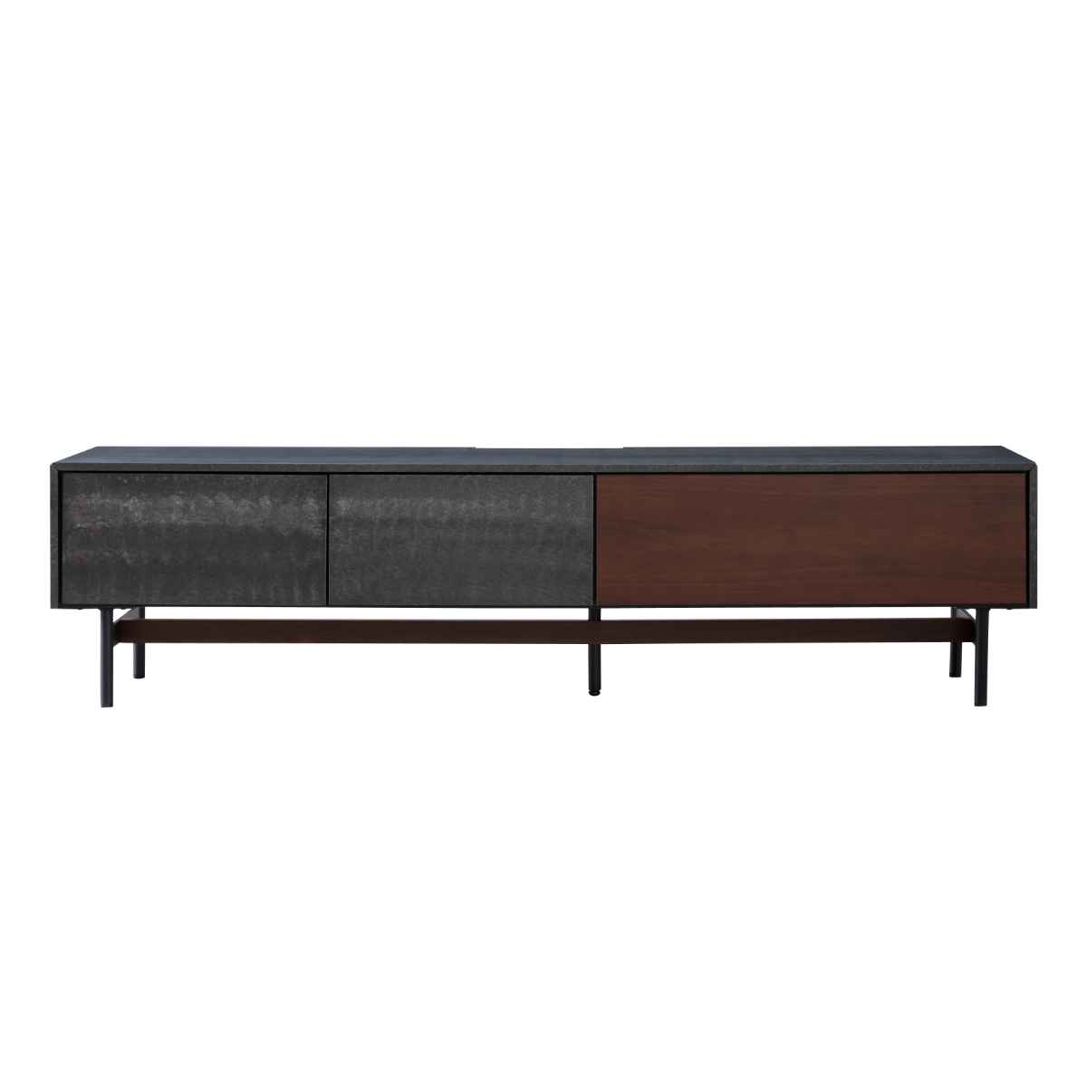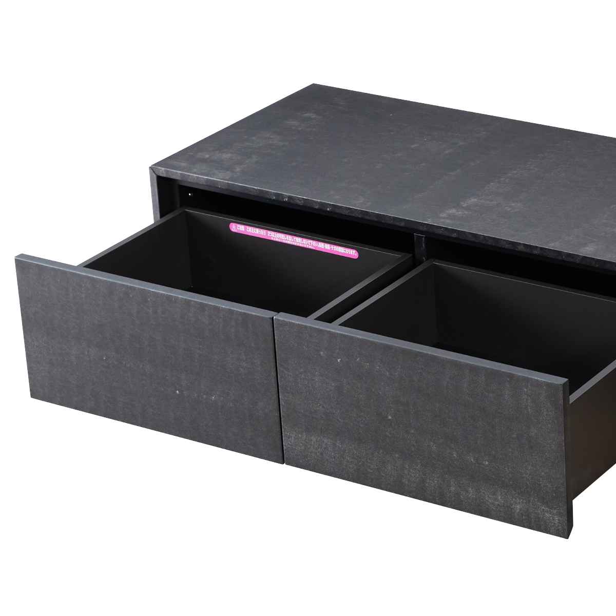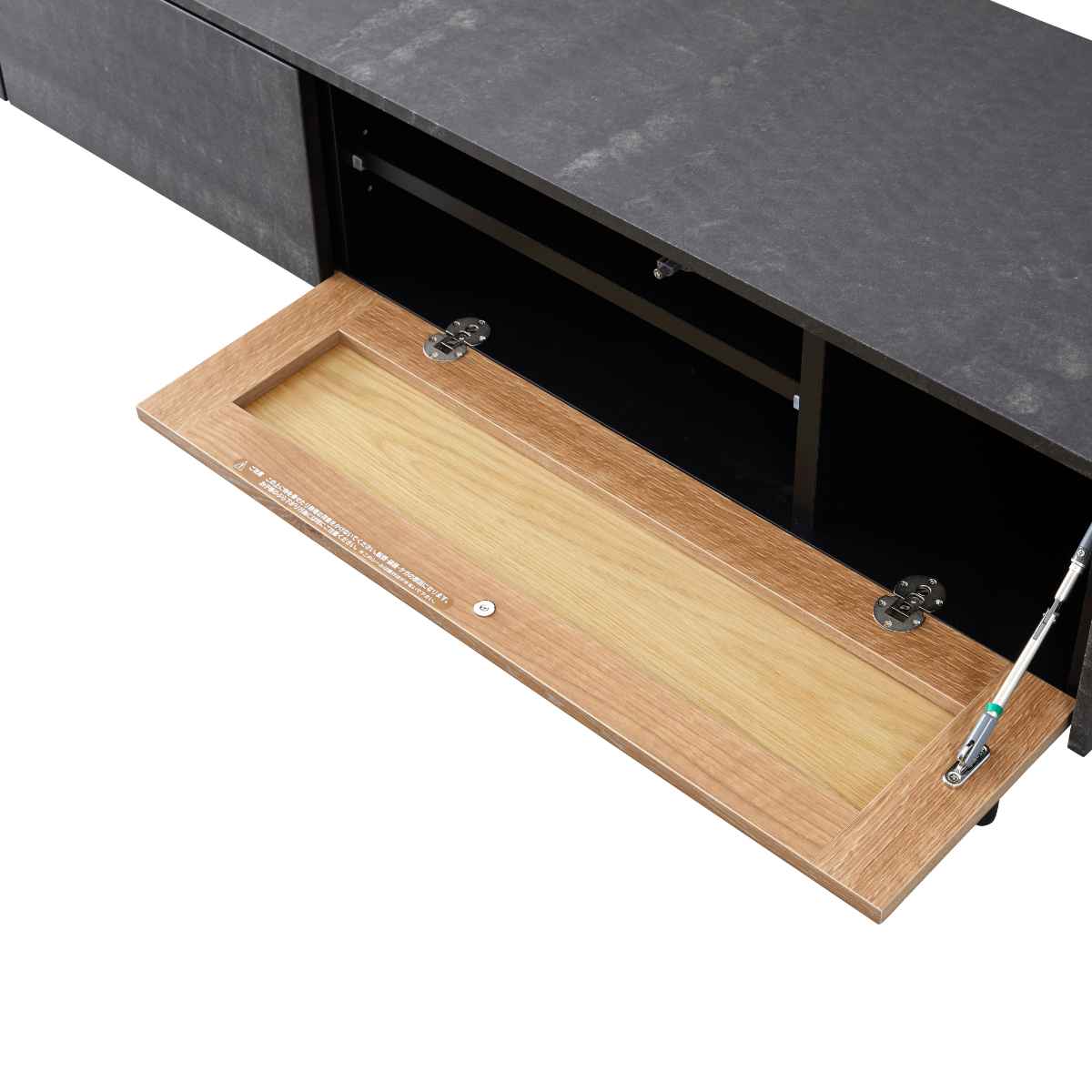 異素材の組み合わせがモダンなデザインのローボードです。フローリングはもちろんタイルやモールテックスなどの床材もマッチします。少しでもリビング収納を増やせるよう、引出収納に加え、 扉内は収納物の幅・高さに合わせた豊富な収納スペースに可動板を完備しています。