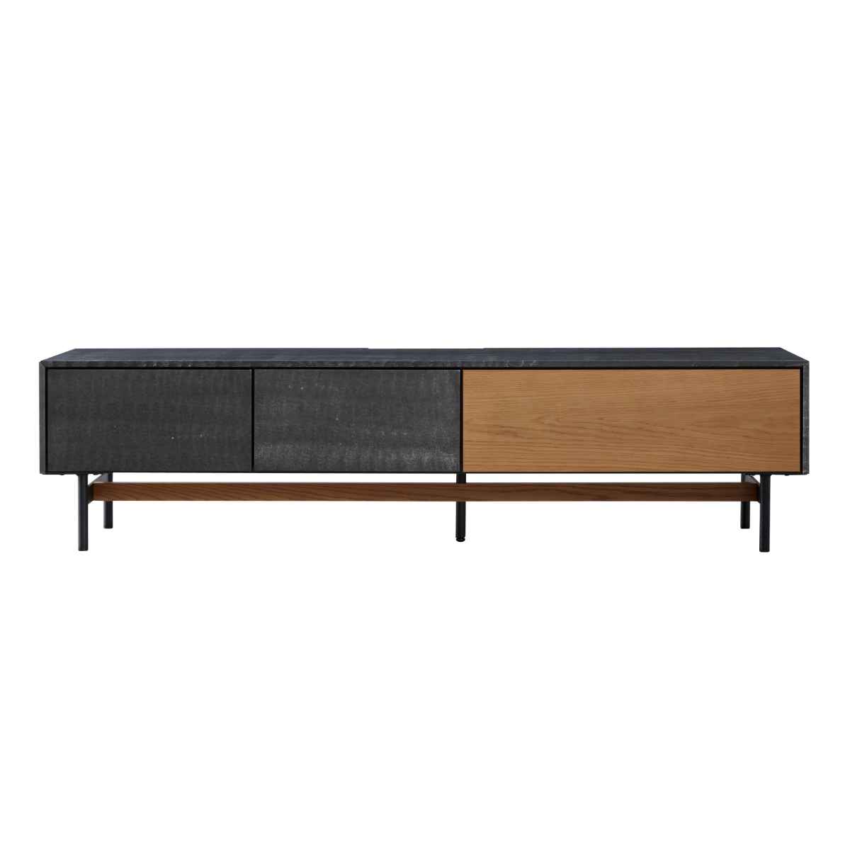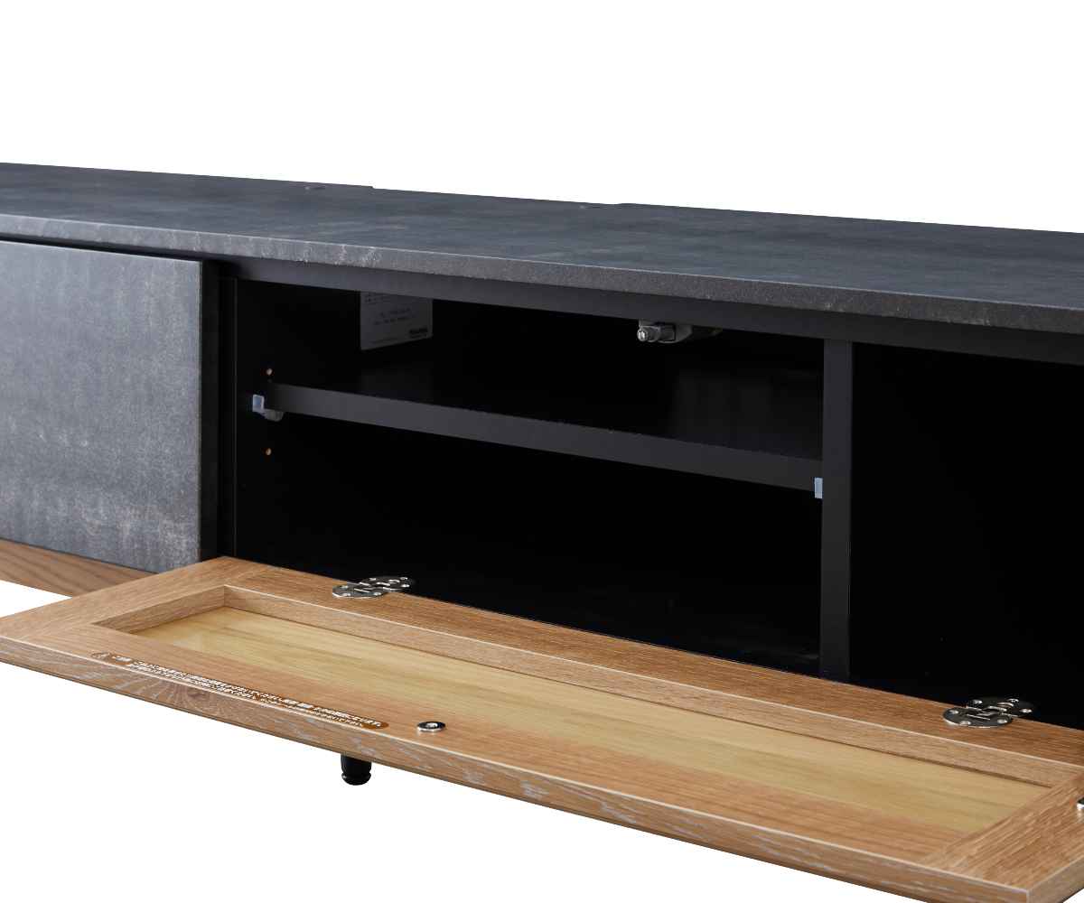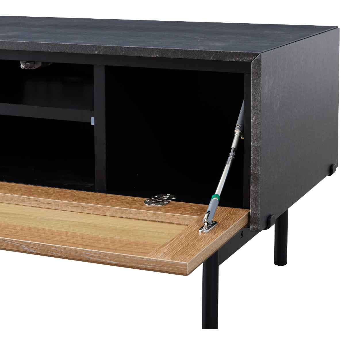 異素材の組み合わせがモダンなデザインのローボードです。フローリングはもちろんタイルやモールテックスなどの床材もマッチします。少しでもリビング収納を増やせるよう、引出収納に加え、 扉内は収納物の幅・高さに合わせた豊富な収納スペースに可動板を完備しています。
