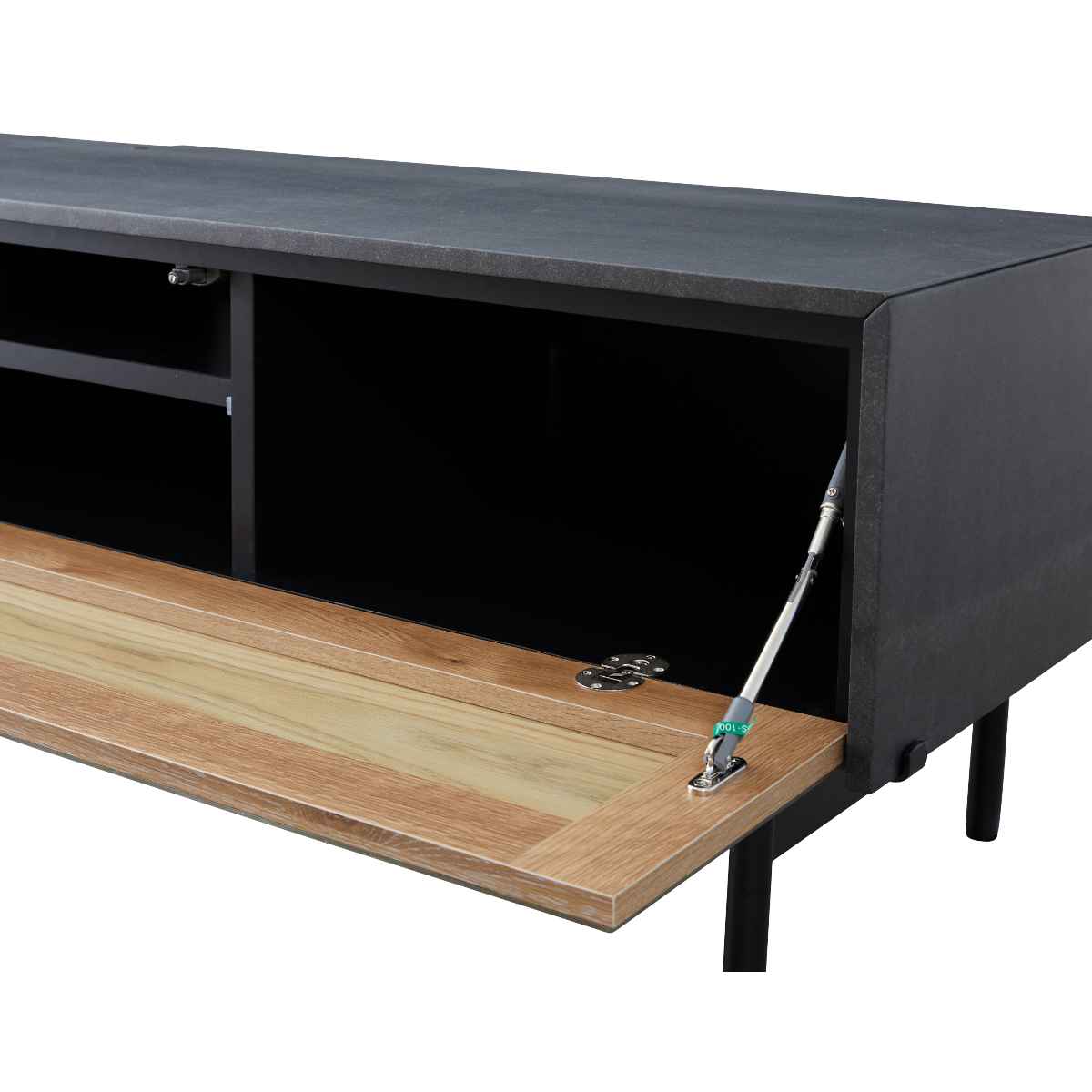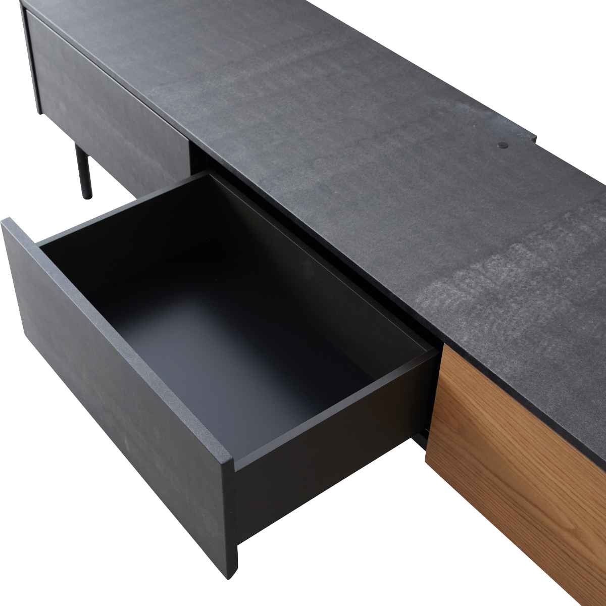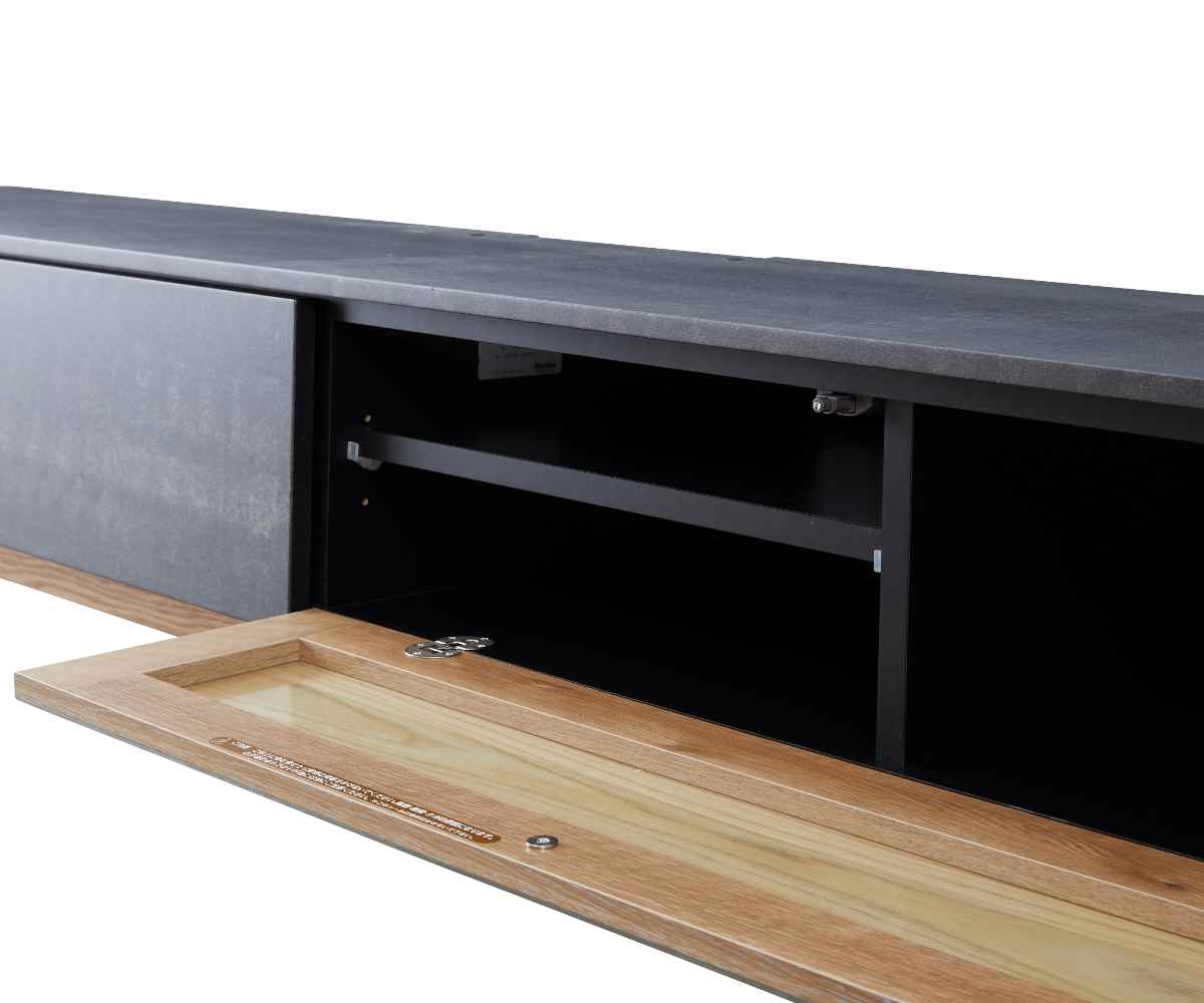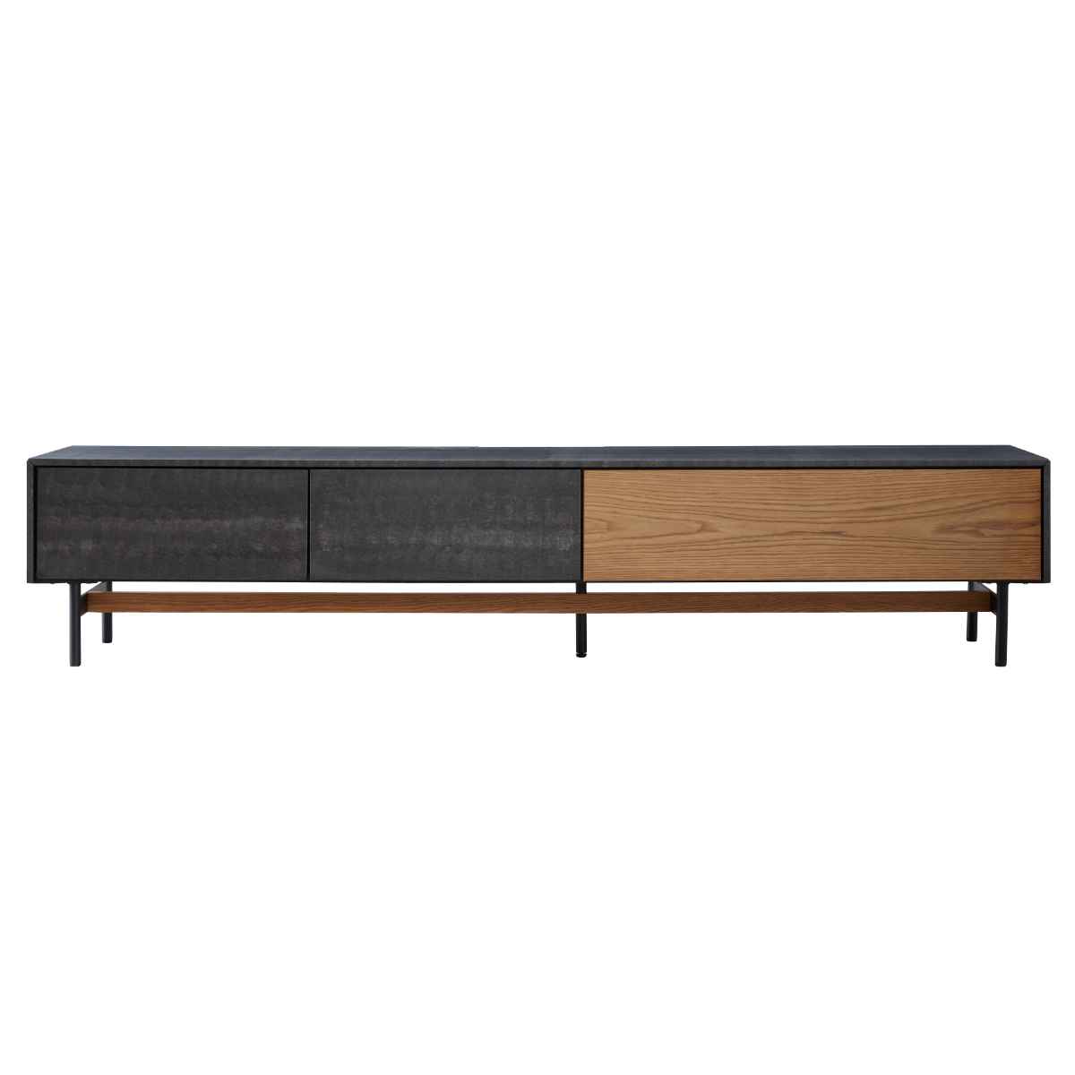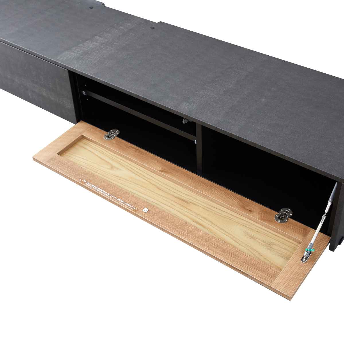 異素材の組み合わせがモダンなデザインのローボードです。フローリングはもちろんタイルやモールテックスなどの床材もマッチします。少しでもリビング収納を増やせるよう、引出収納に加え、 扉内は収納物の幅・高さに合わせた豊富な収納スペースに可動板を完備しています。