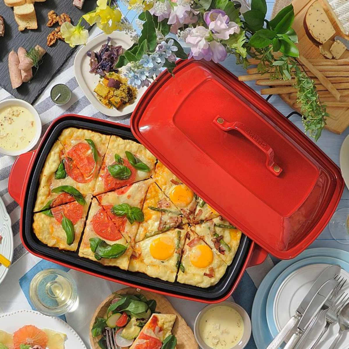 平面プレートとたこ焼きプレートの2種類のプレートがセットになっています。料理のアイディアが広がる2枚のプレートは、「焼く」はもちろん、フタを使って「蒸す」もおしゃれにこなします。プレートを使い分けて、前菜からデザートまで幅広い料理の出来立てをその場でシェアして楽しめます。