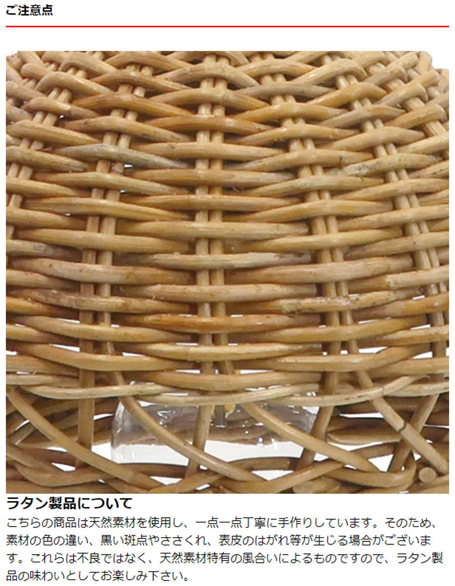 こちらの商品は天然素材を使用し、一点一点丁寧に手作りしています。そのため、素材の色の違い、黒い斑点やささくれ、表皮のはがれ等が生じる場合がございます。これらは不良ではなく、天然素材特有の風合いによるものですので、ラタン製品の味わいとしてお楽しみ下さい。