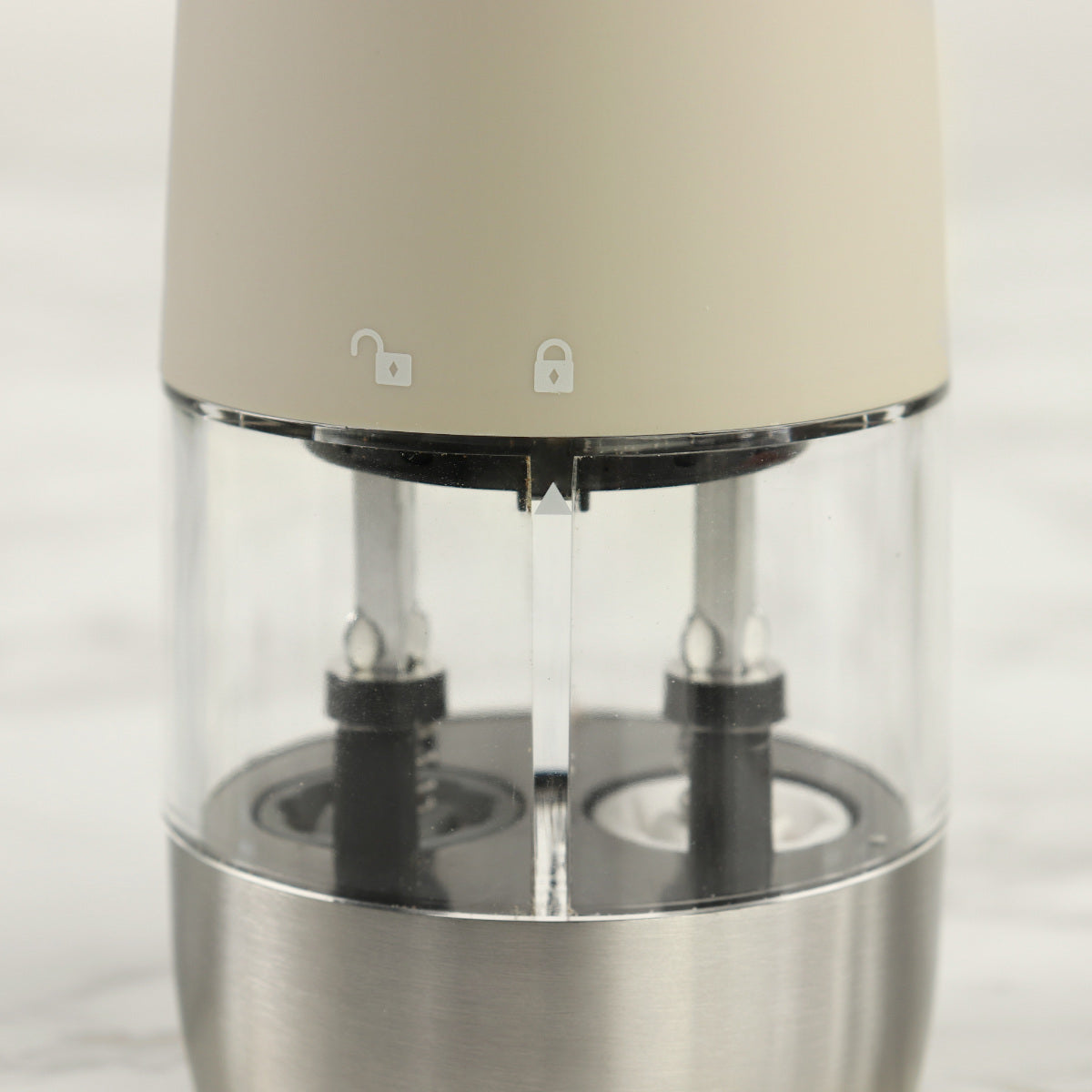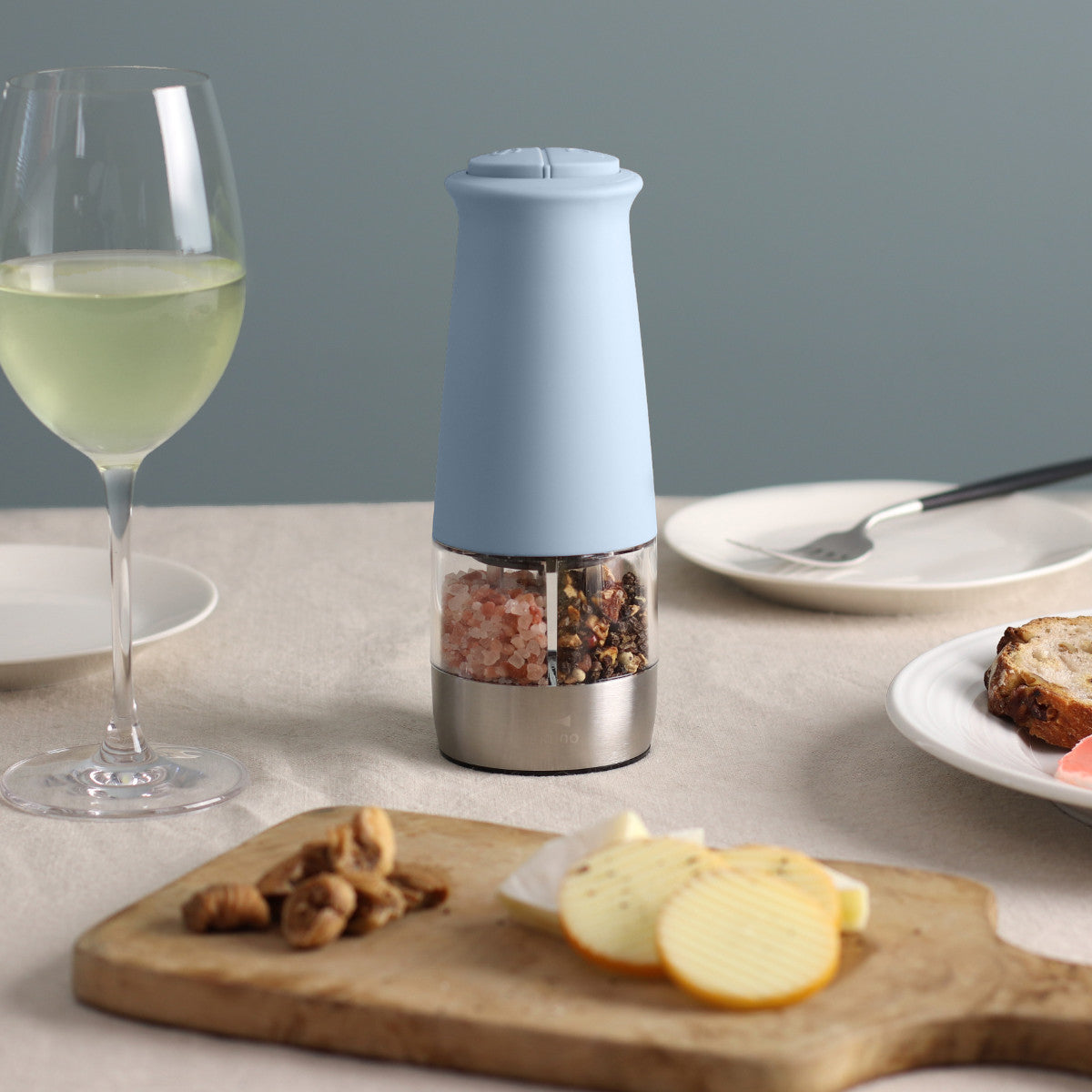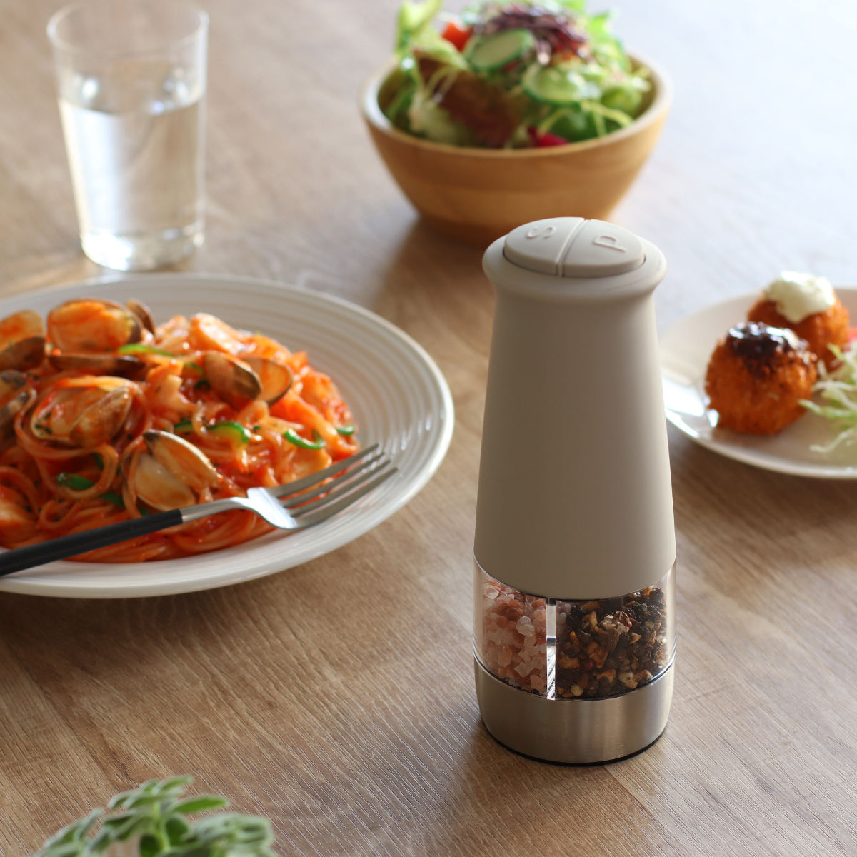 電動式なので、調理中や下ごしらえ中に片手が塞がっている時でもサッと手に取って片手で挽くことができます。くびれ形状の本体が手にフィットし、しっかり握れます。