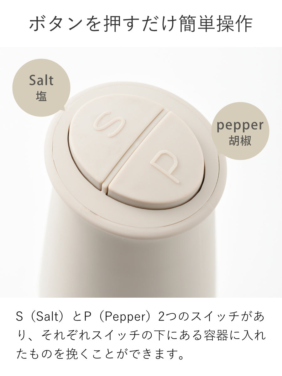 S(Salt)とP(Pepper)2つのスイッチがあり、それぞれスイッチの下にある容器に入れたものを挽くことができます。