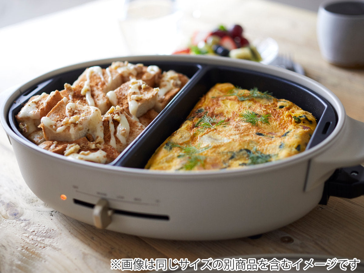 ハーフサイズのプレート2枚がセットになった「ハーフプレート」を使えば、異なるお料理をひとつのホットプレートで同時に作ることができます。忙しい朝でも、まとめてさっと朝食のメニューを作れるので時短にもなります。