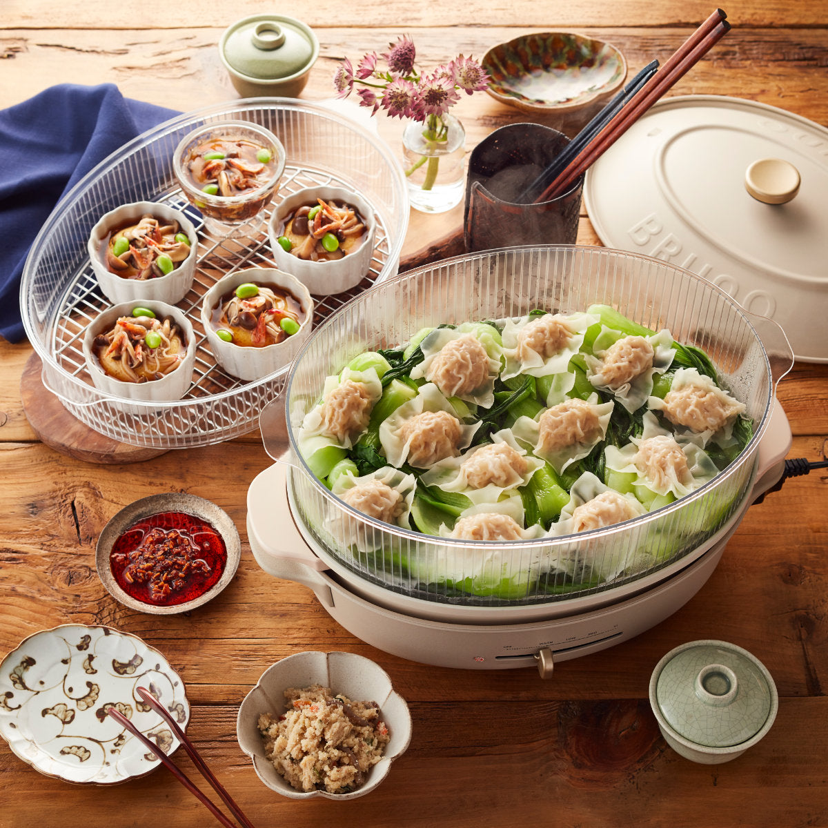2段式なので、上下それぞれ同時調理も可能です。うま味と栄養が詰まった蒸し汁が下の段へ落ちるので、食材のうま味を余すことなく活かせます。1段は茶碗蒸し、もう1段には蒸し料理といった使い方もおすすめ。1段だけでも使えるので、食卓を囲む人数によって調整できます。