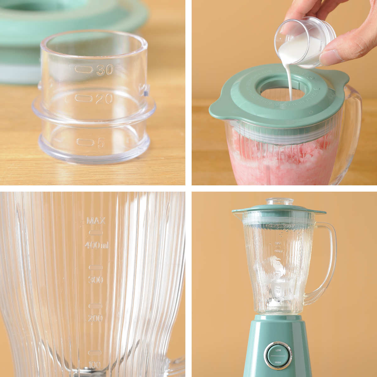 キャップとジャーには計量に便利な目盛りが付いています。キャップの目盛は牛乳やシロップを追加する際に、ジャーの目盛は出来上がりの容量の目安にできたりと、メジャーカップや軽量スプーンを出す手間が省けます。
