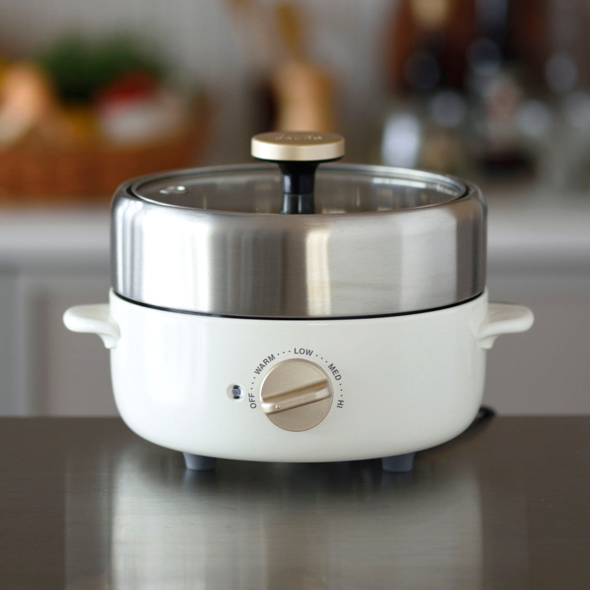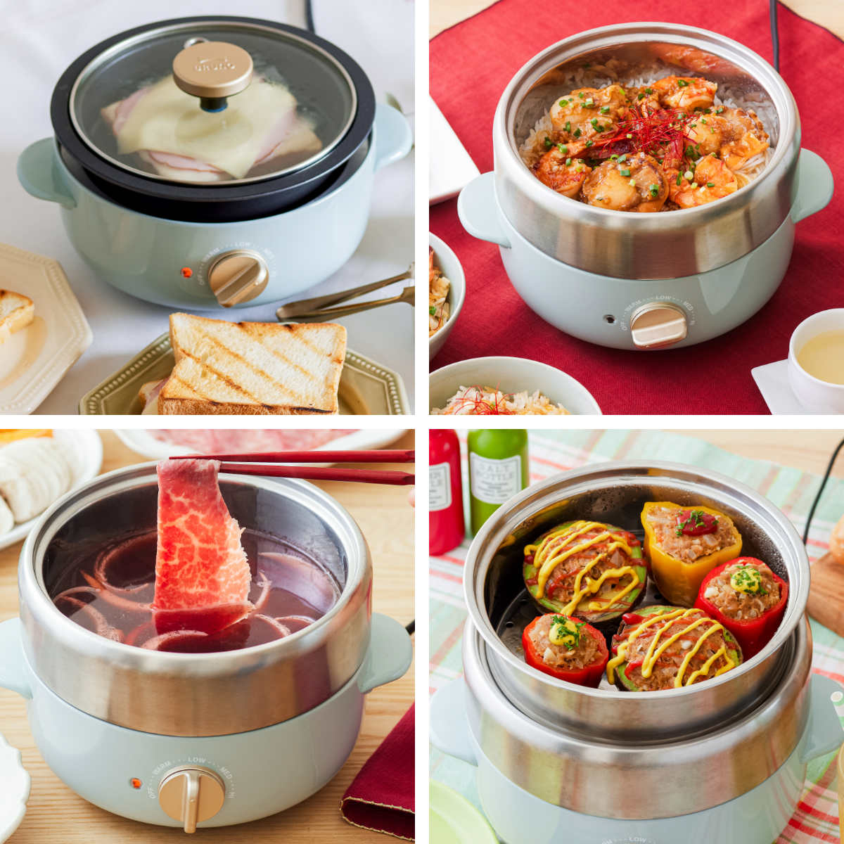コンパクトマルチグリルポットは1台で、煮る・焼く・蒸す・揚げるの4役をこなす多機能な電気鍋です。調理のだいたいのことがひとつの鍋でできてしまうので、何台も鍋を用意する必要がなく便利です。卓上で囲む料理の幅がグッと広がります。
