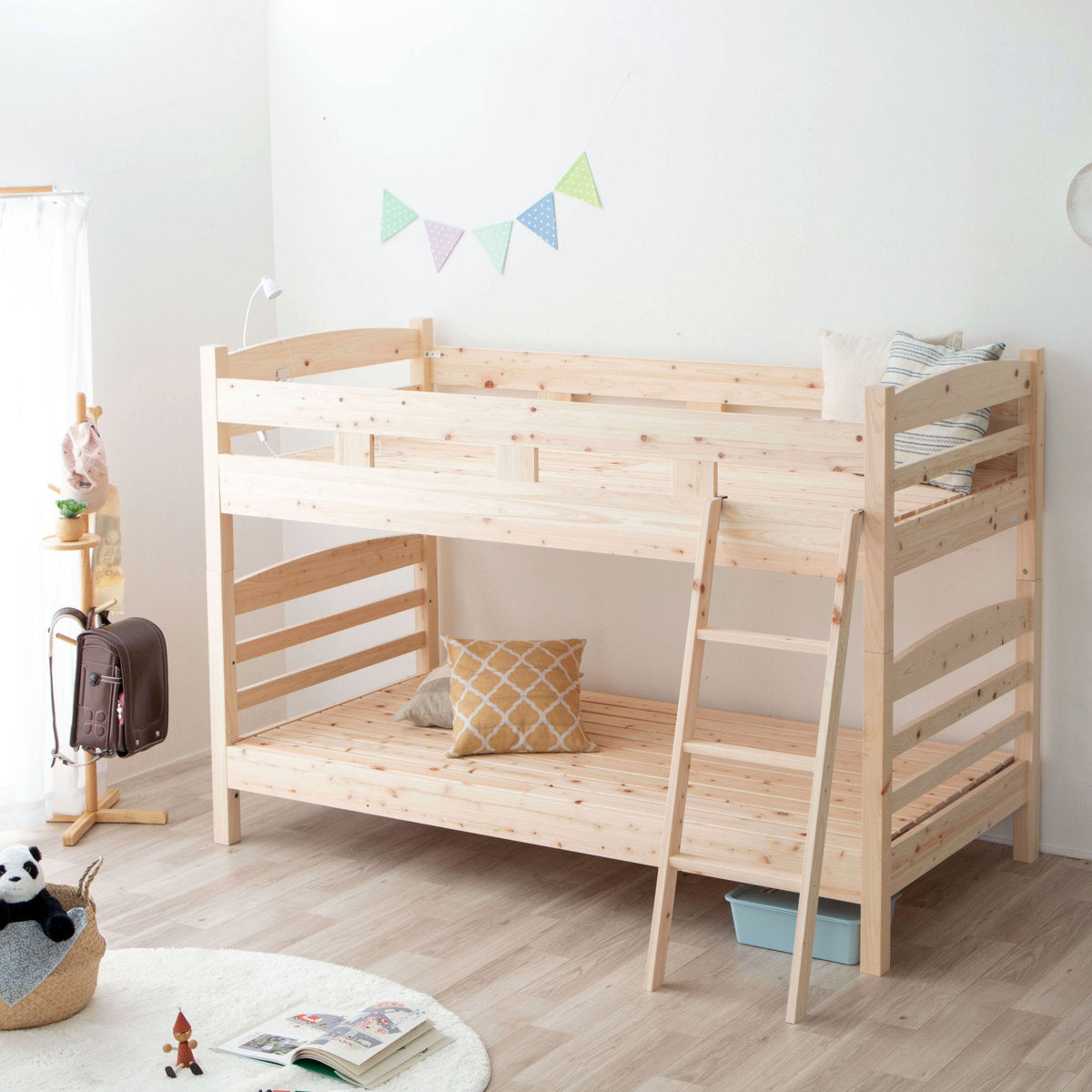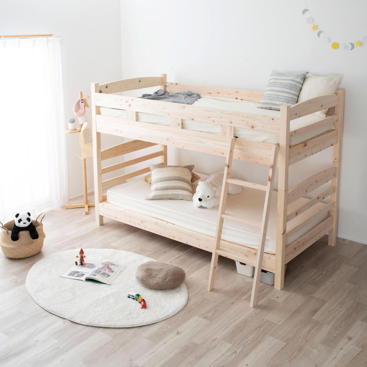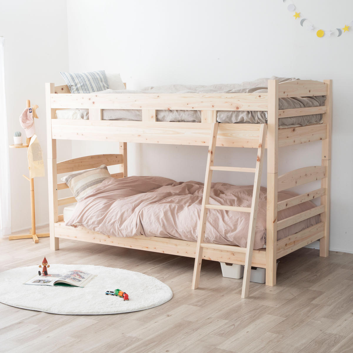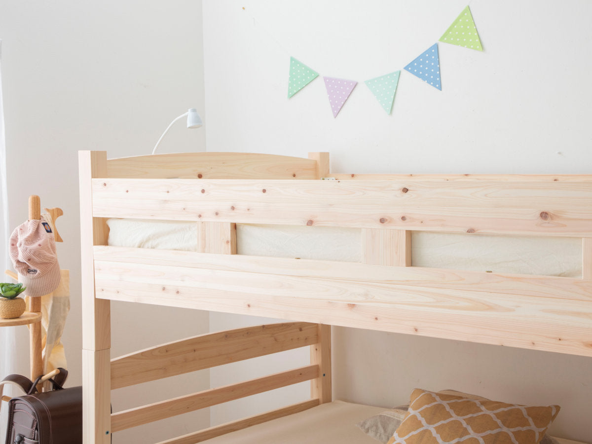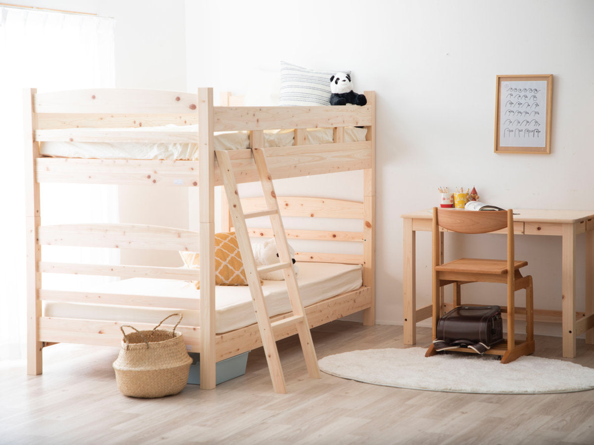 島根県・高知県四万十でとれたひのき材を贅沢に使用した2段ベッドです。木目を活かした素朴でシンプルなデザインは、お部屋に優しい雰囲気を与えてくれます。弟妹が生まれたり、お子様が一人寝できるようになった時期におすすめです。