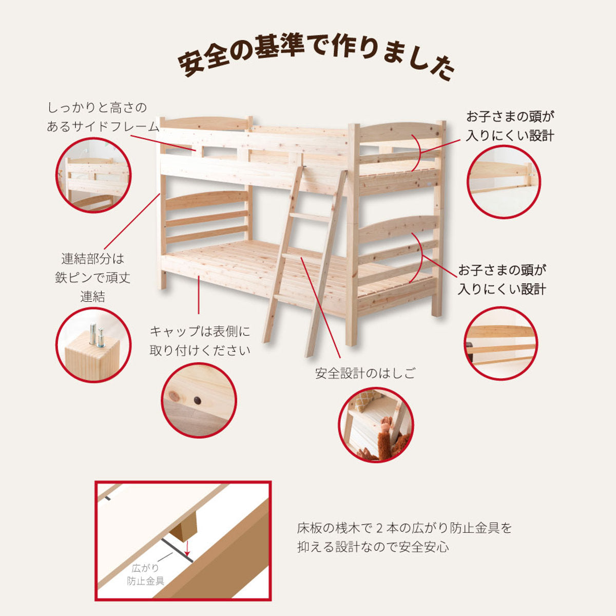階段の踏板の奥行、柵の高さ、部材の間隔など厳しい基準をクリアした安全な製品です。ベッド1台につき100kgと耐荷重もばっちりです。