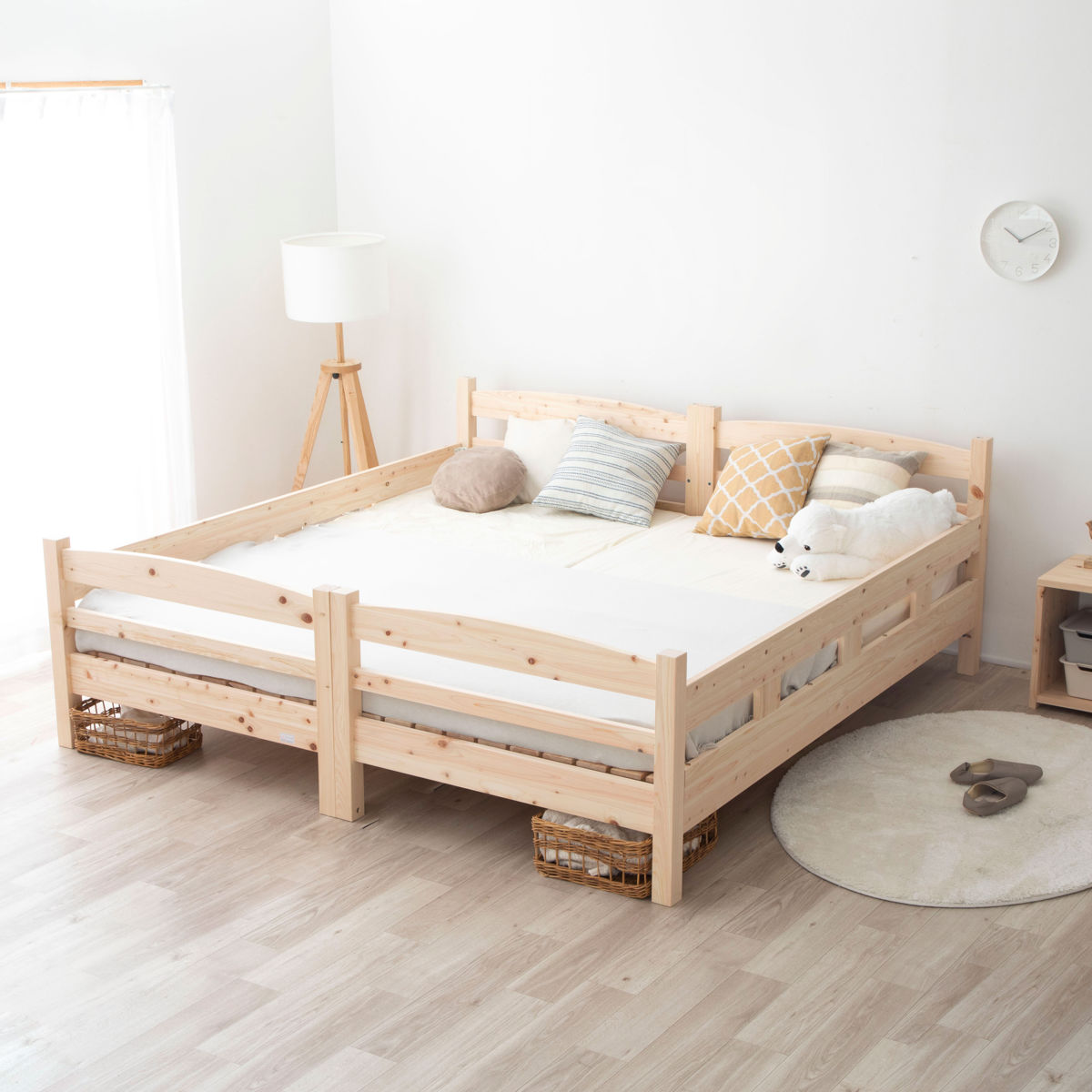 ベッドを連結してキングサイズにすればご家族で川の字ベッドとして広々とお使いいただけます。専用金具で2か所留めることで、ズレることなくピッタリと連結できます。