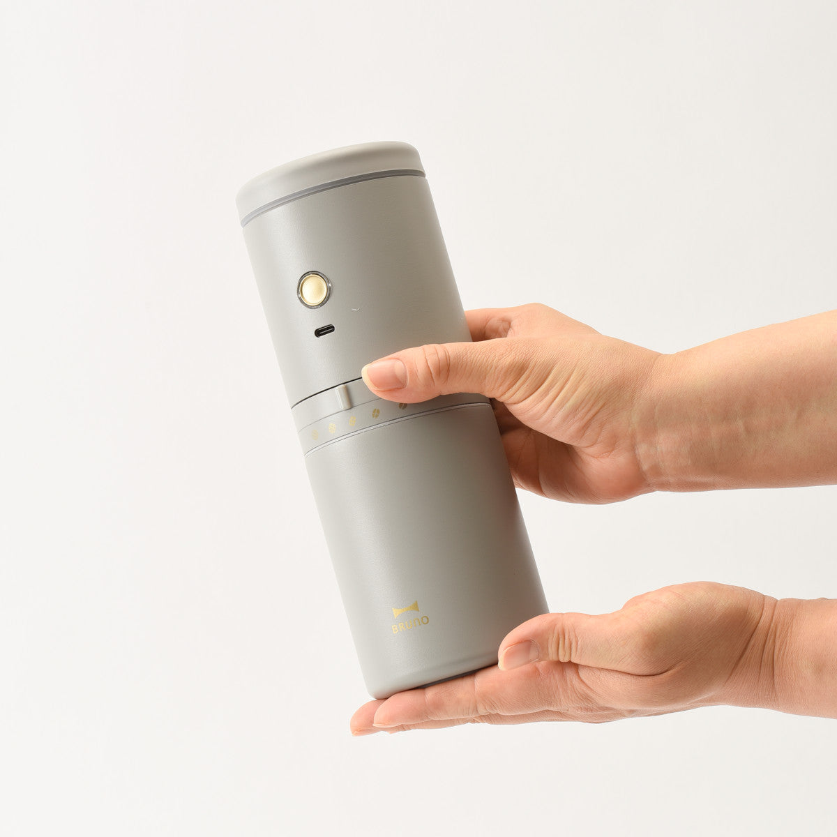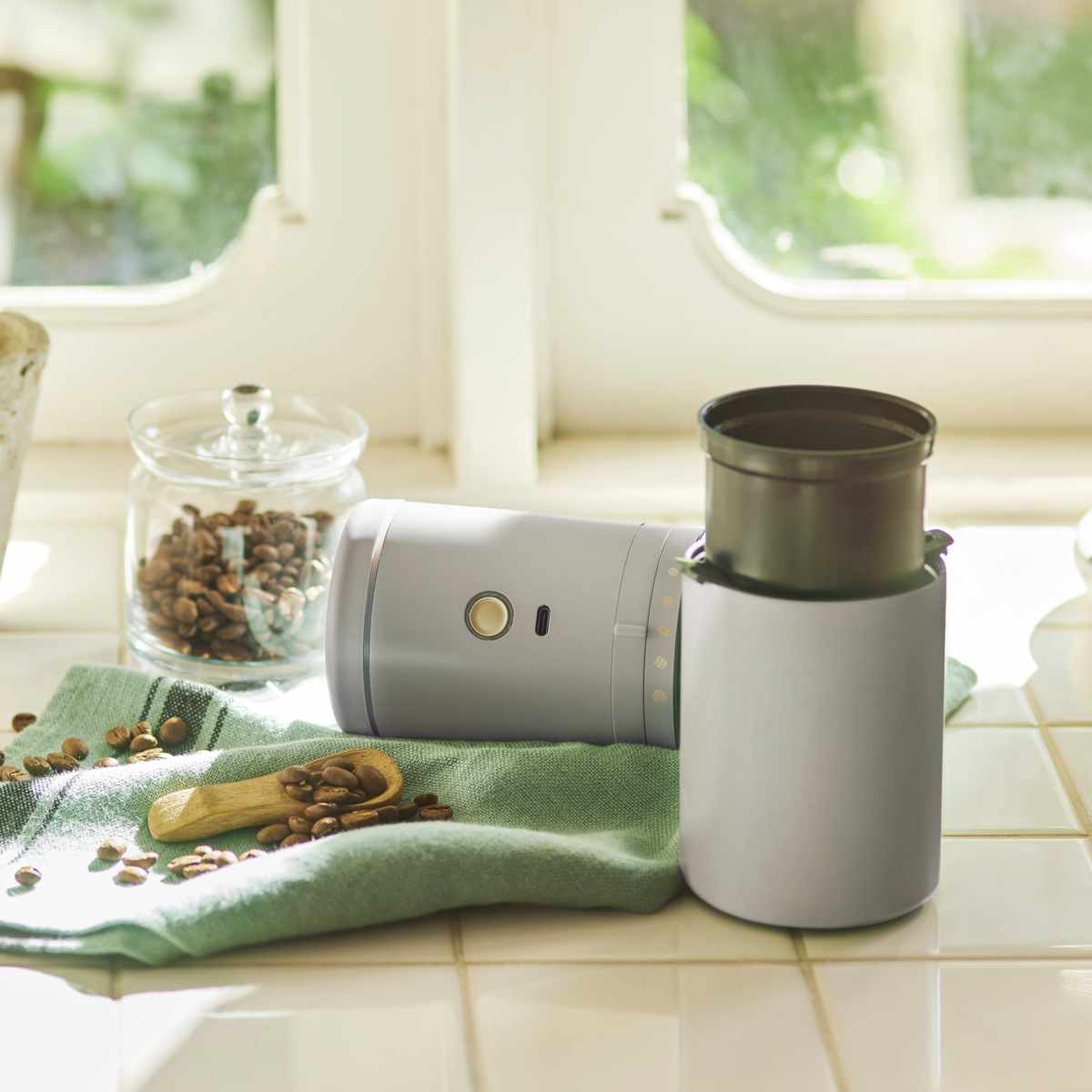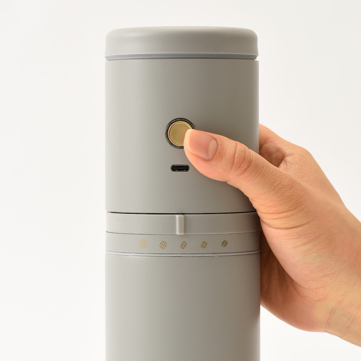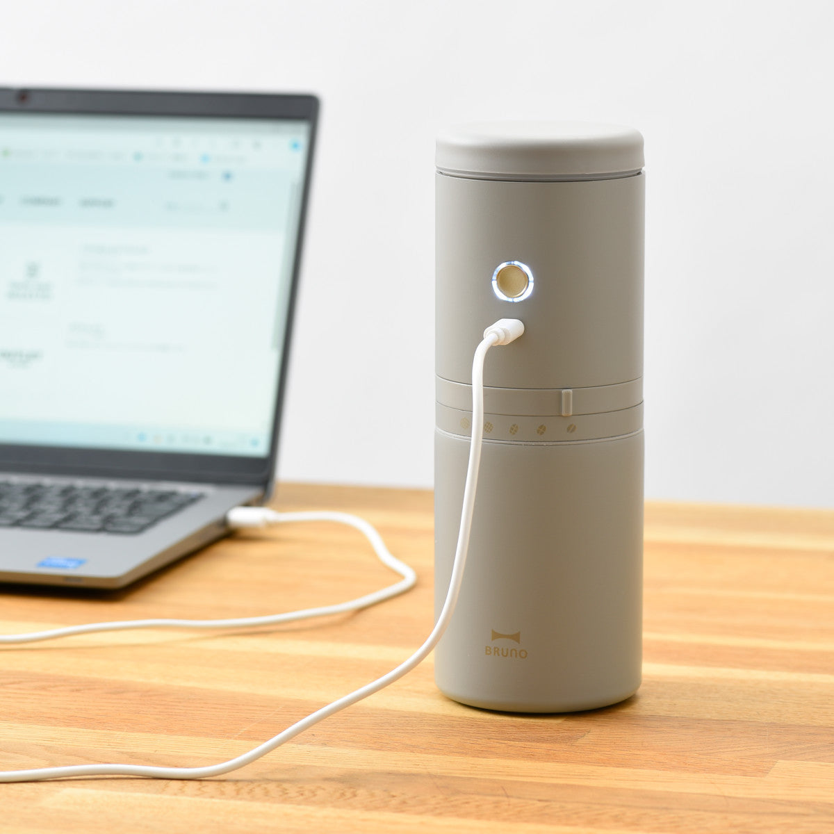 付属のUSBケーブルをPCなどに繋いで充電可能なので、オフィスや自宅でのリモートワークからアウトドアまで様々なシーンで挽きたてのコーヒーを楽しむことができます。