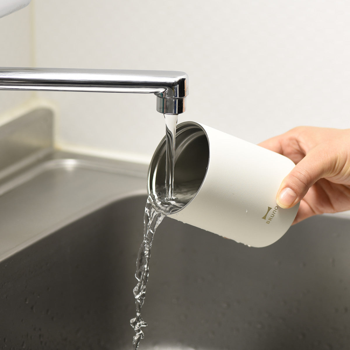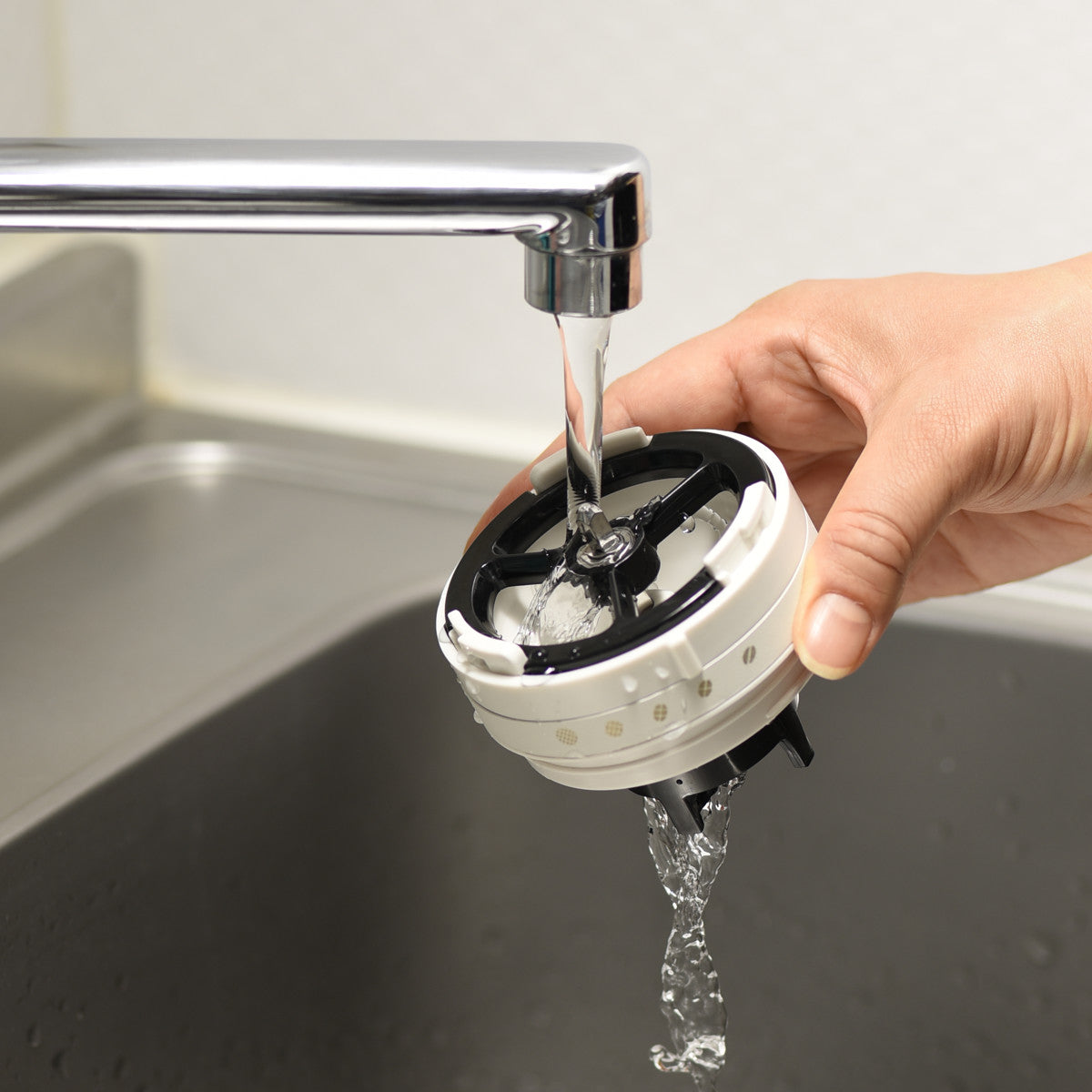 モーター部以外のフタやミル部、カップは食器用の中性洗剤を使って洗浄することができるので、いつも清潔に保てます。モーター部は乾いた布か、水道水を含ませてかたく絞った濡れタオル等で拭いてください。絶対に水洗いはしないでください。