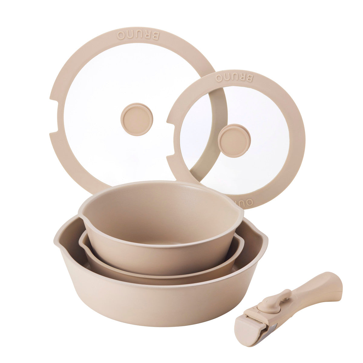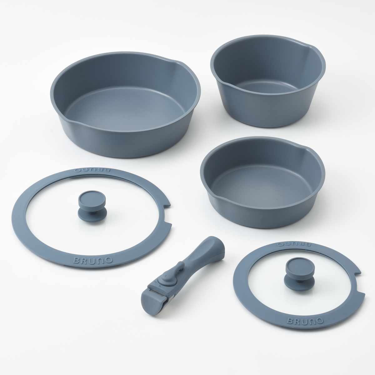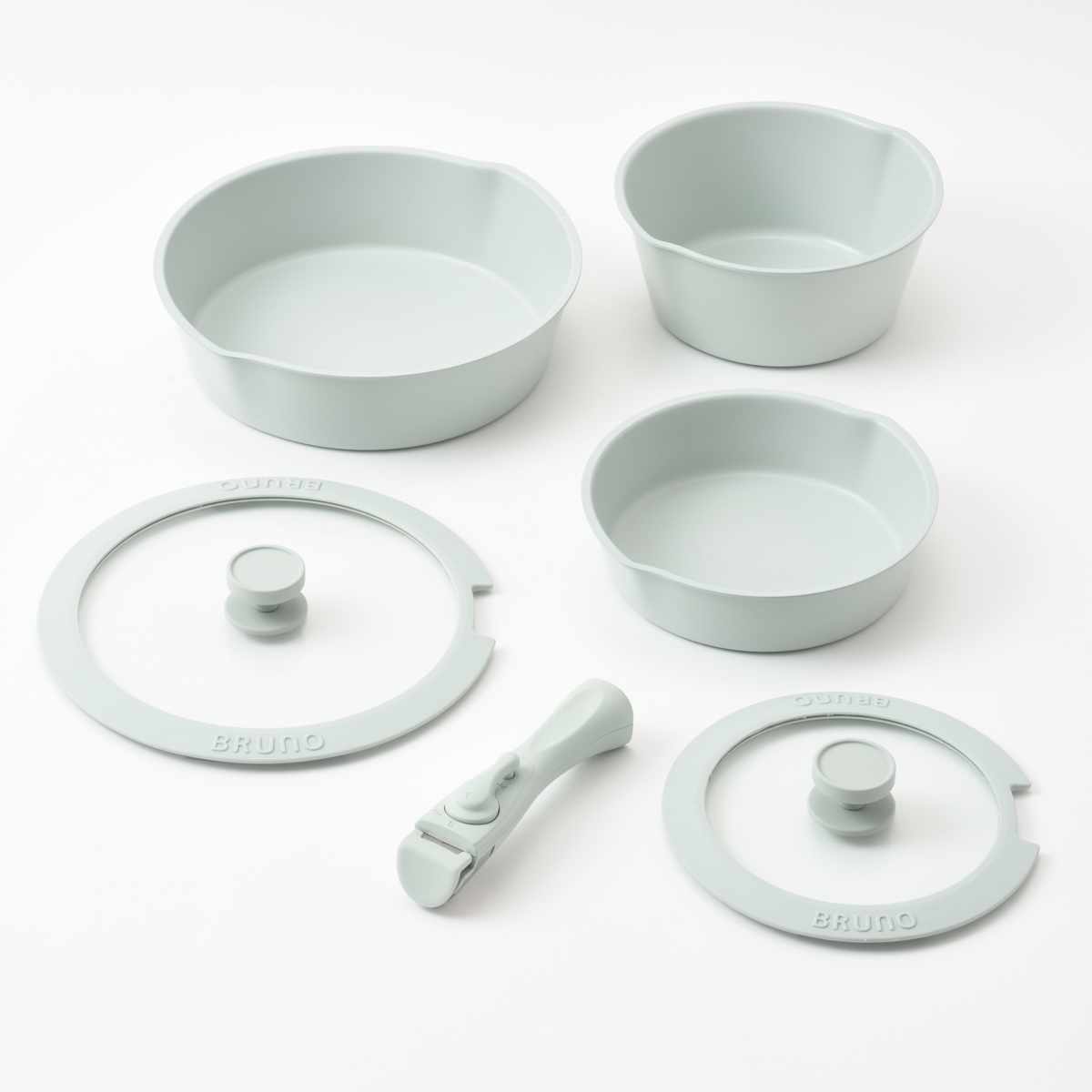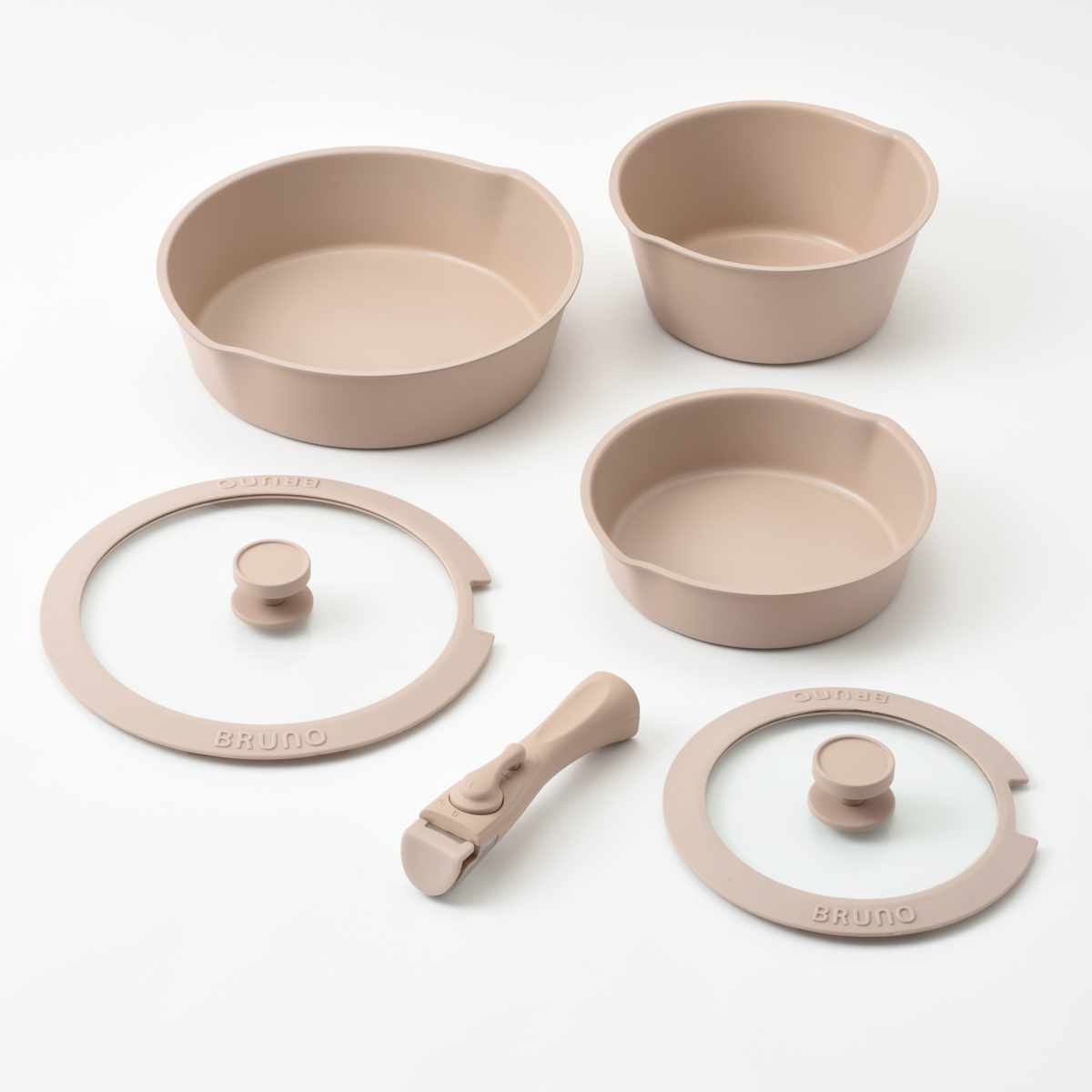 BRUNOらしいニュアンスカラーが素敵な取っ手が外せるフライパン6点セット(フライパン20cm・26cm、片手鍋20cm、蓋20cm・26cm、取っ手)です。調理したあと、そのまま食器として使いたくなるような、お皿の形状にもこだわったフライパンです。