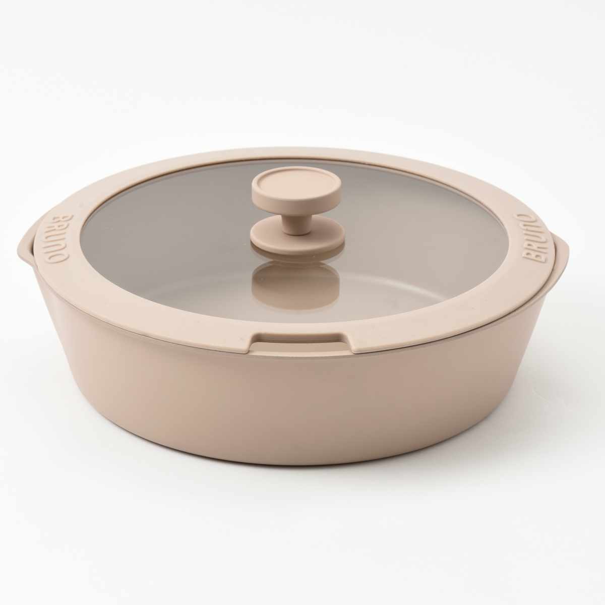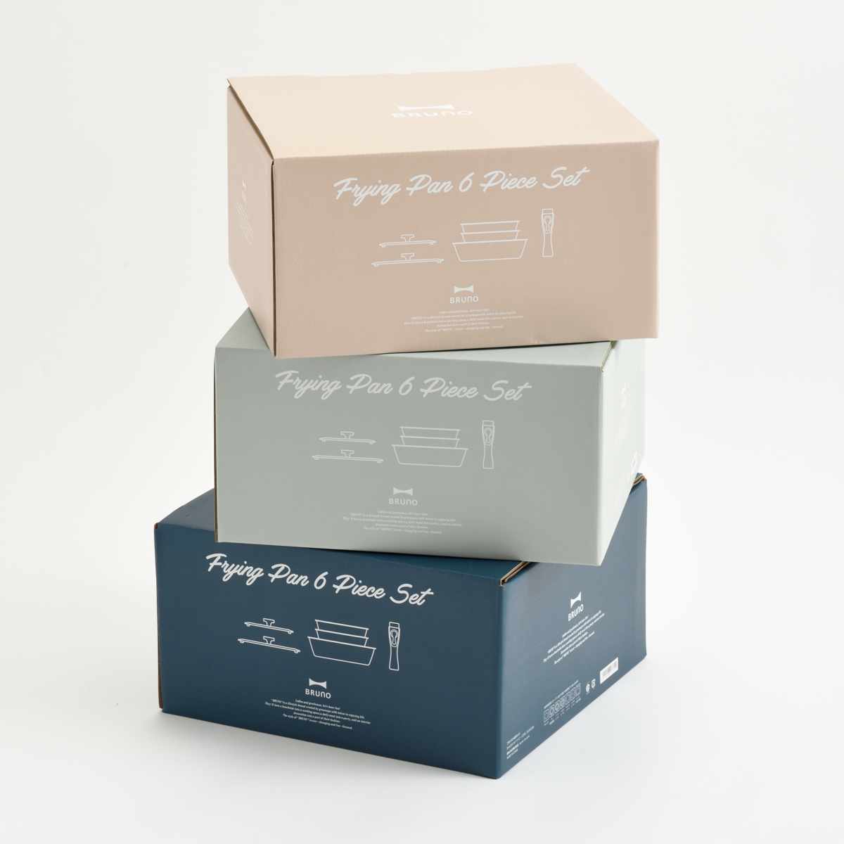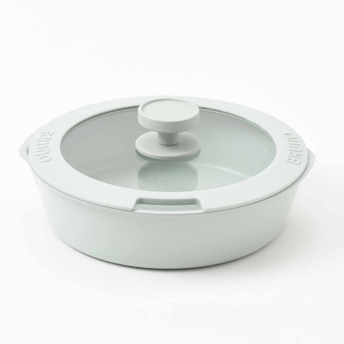 BRUNOらしいニュアンスカラーが素敵な取っ手が外せるフライパン6点セット(フライパン20cm・26cm、片手鍋20cm、蓋20cm・26cm、取っ手)です。調理したあと、そのまま食器として使いたくなるような、お皿の形状にもこだわったフライパンです。
