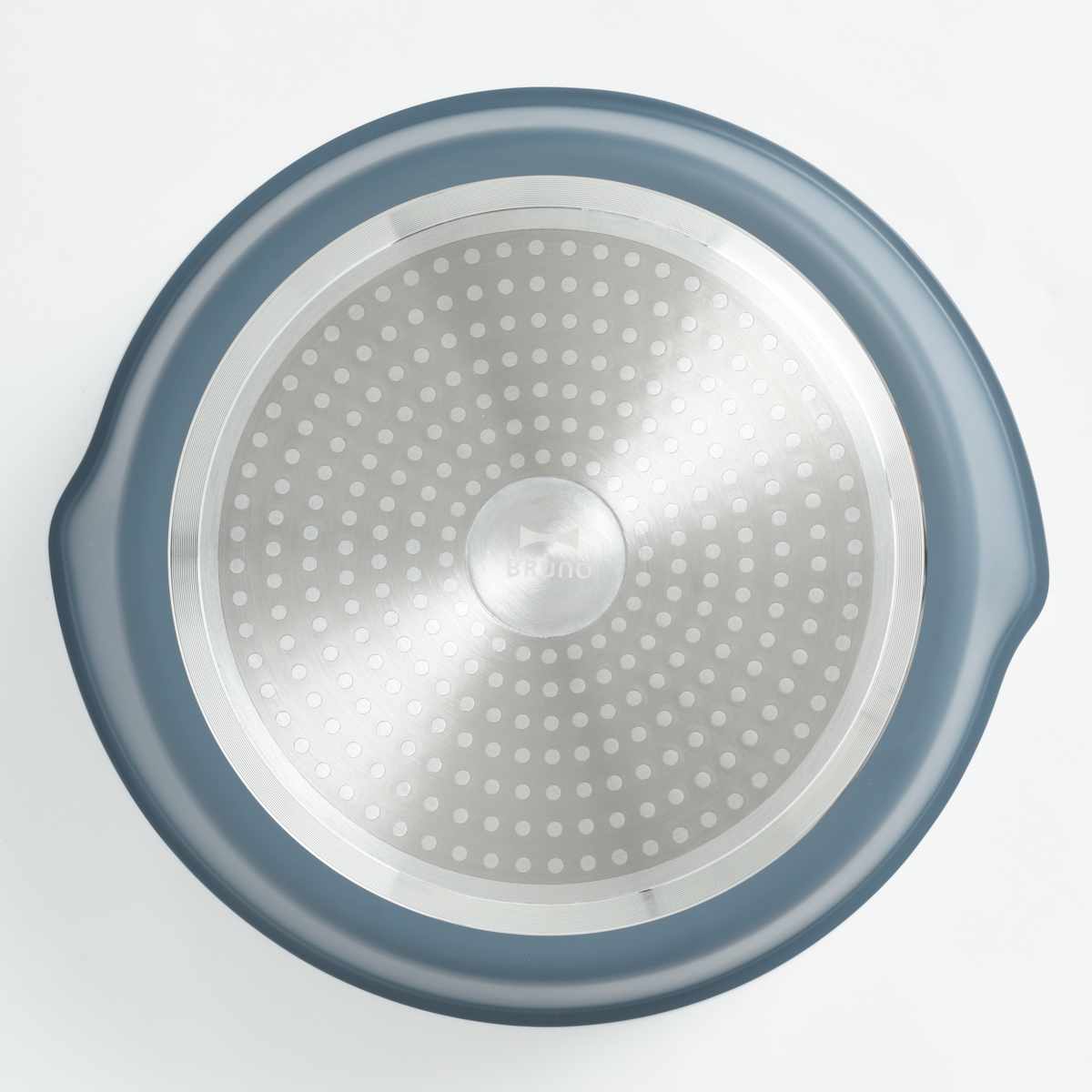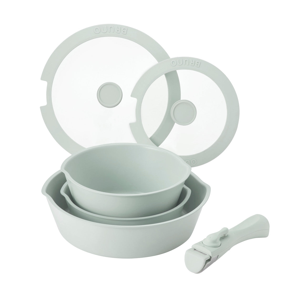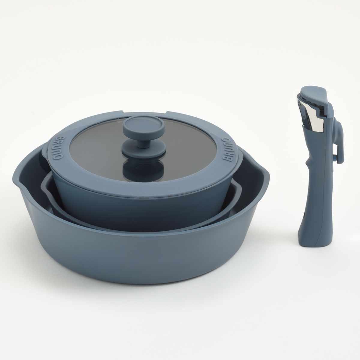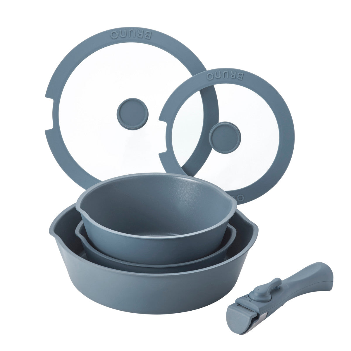 BRUNOらしいニュアンスカラーが素敵な取っ手が外せるフライパン6点セット(フライパン20cm・26cm、片手鍋20cm、蓋20cm・26cm、取っ手)です。調理したあと、そのまま食器として使いたくなるような、お皿の形状にもこだわったフライパンです。