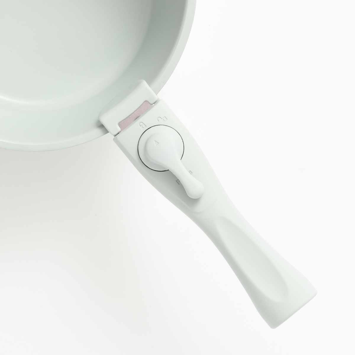 2.ロックを解除した状態で、取っ手をフライパンまたは鍋のフチに引っかけ挟みます。