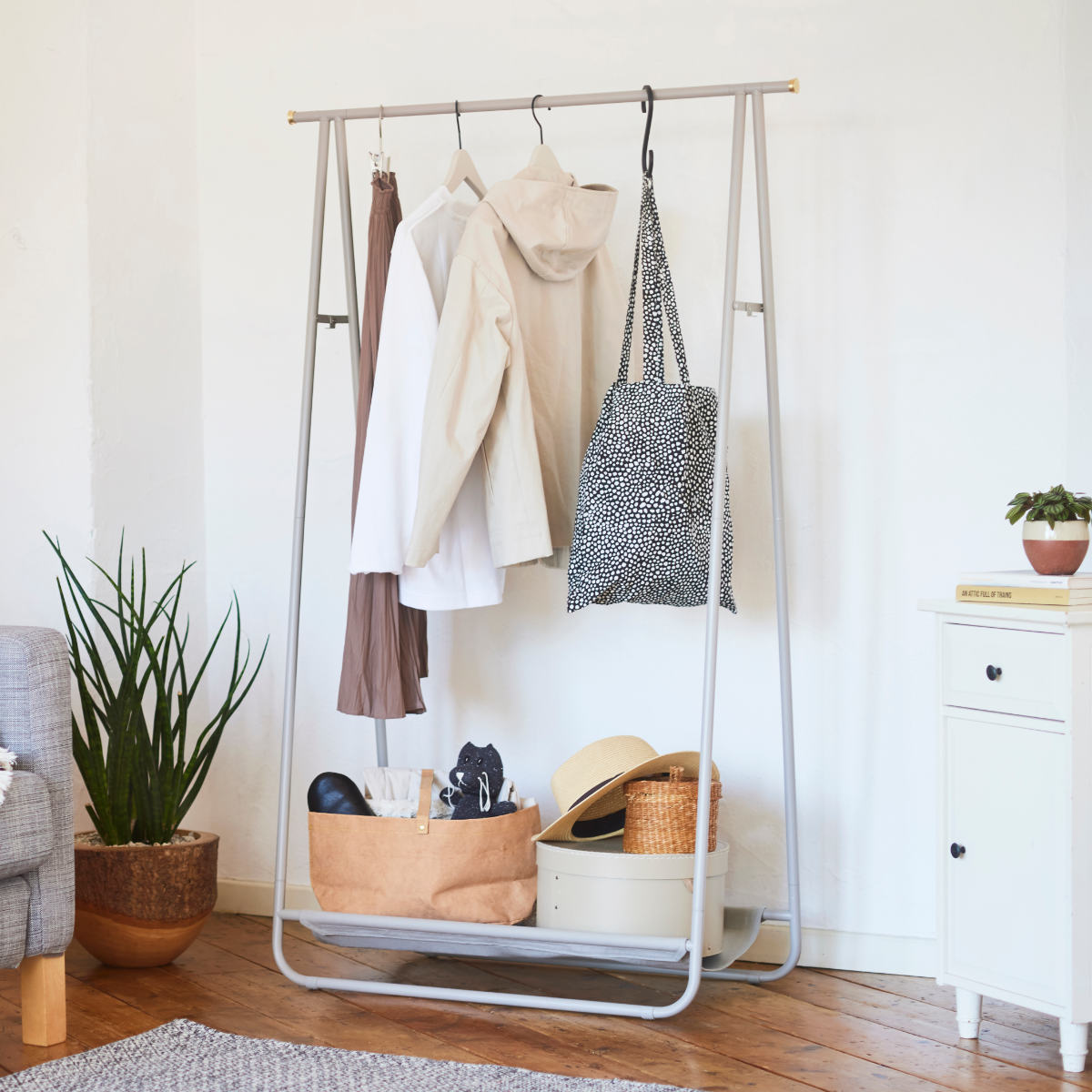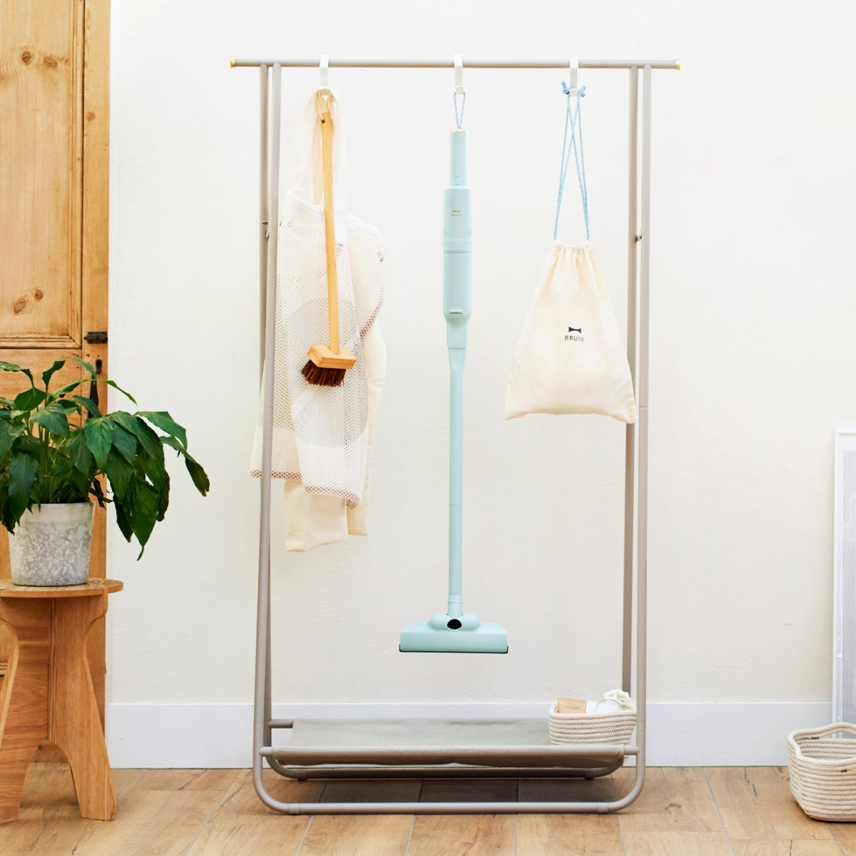 スチールフレームにファブリックラックを組み合わせたA型ハンガーラックです。お気に入りの洋服やバッグなどをディスプレイしながら収納できます。室内干しとしても衣類収納としてもお使いいただけます。BRUNOらしいカラーリングのラックは、インテリアになじみやすいです。