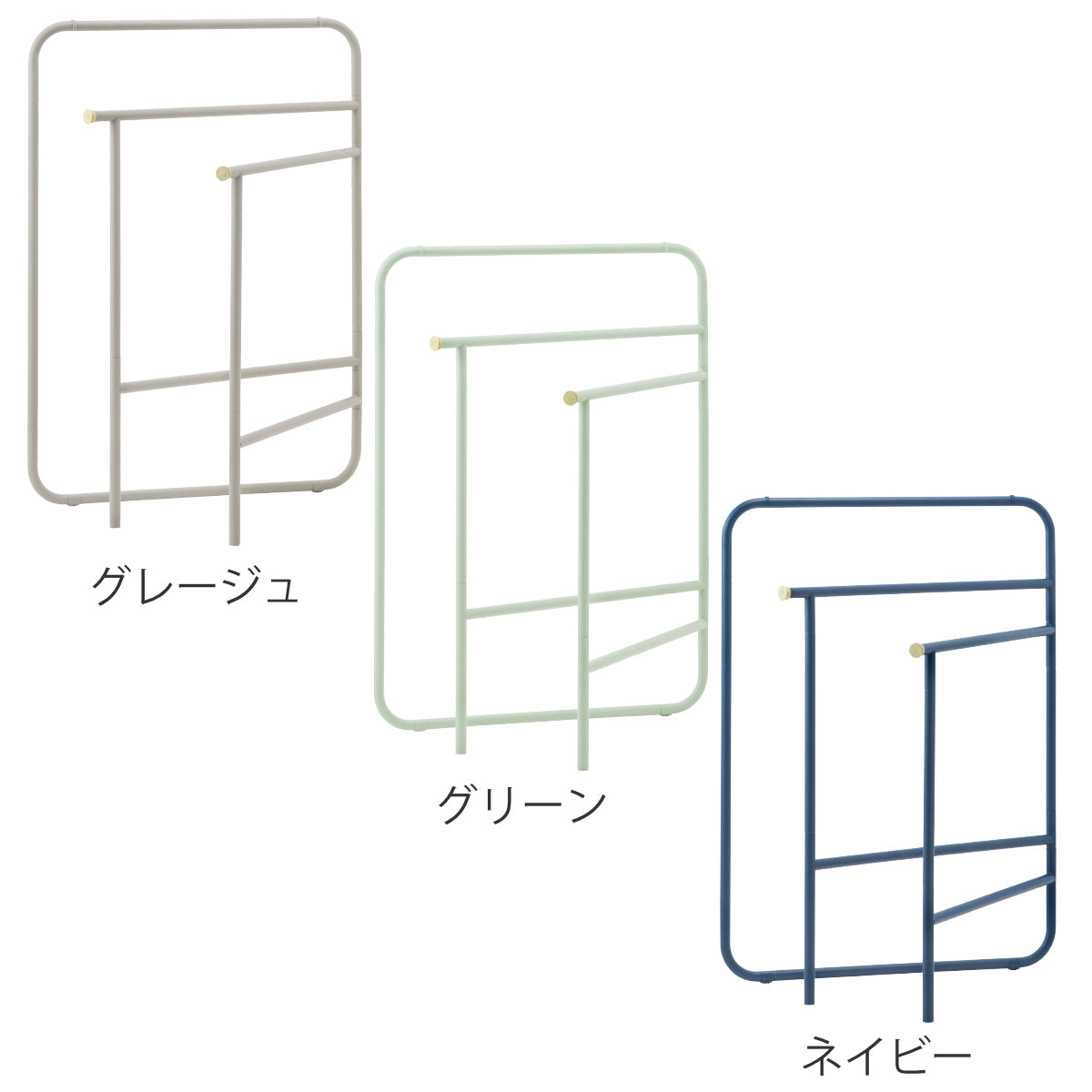 高さの異なる3本のバーで、タオルやバスタオルなどを風通しよく干すことができます。一番高いポールでも高さ87cmと、小柄な方やお子様でも使いやすい設計です。