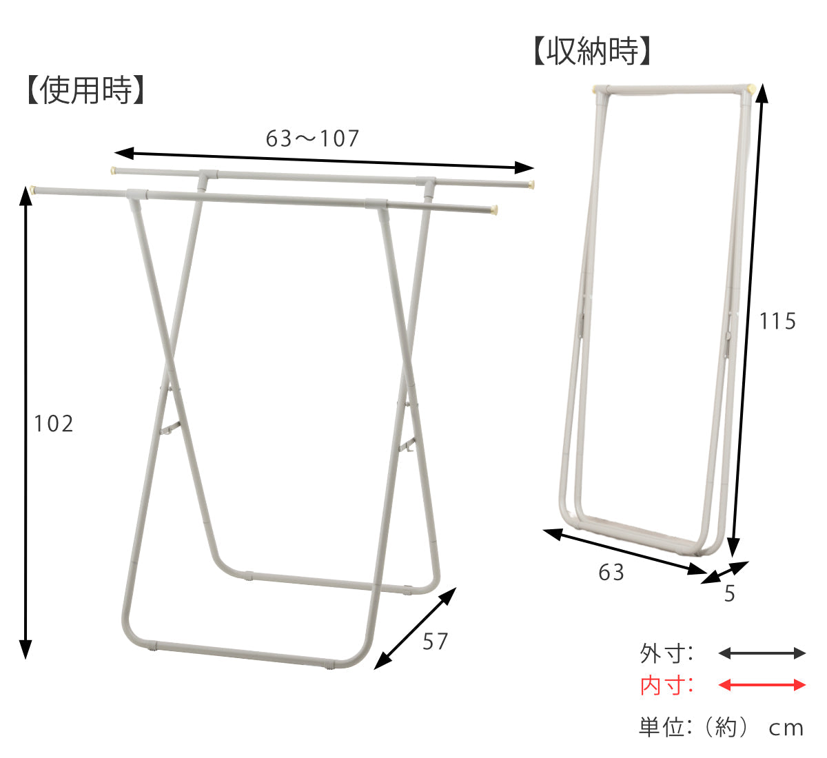 サイズ | 使用時:約 幅63~107×奥行57×高さ102cm 収納時:約 幅63×奥行5×高さ115cm |