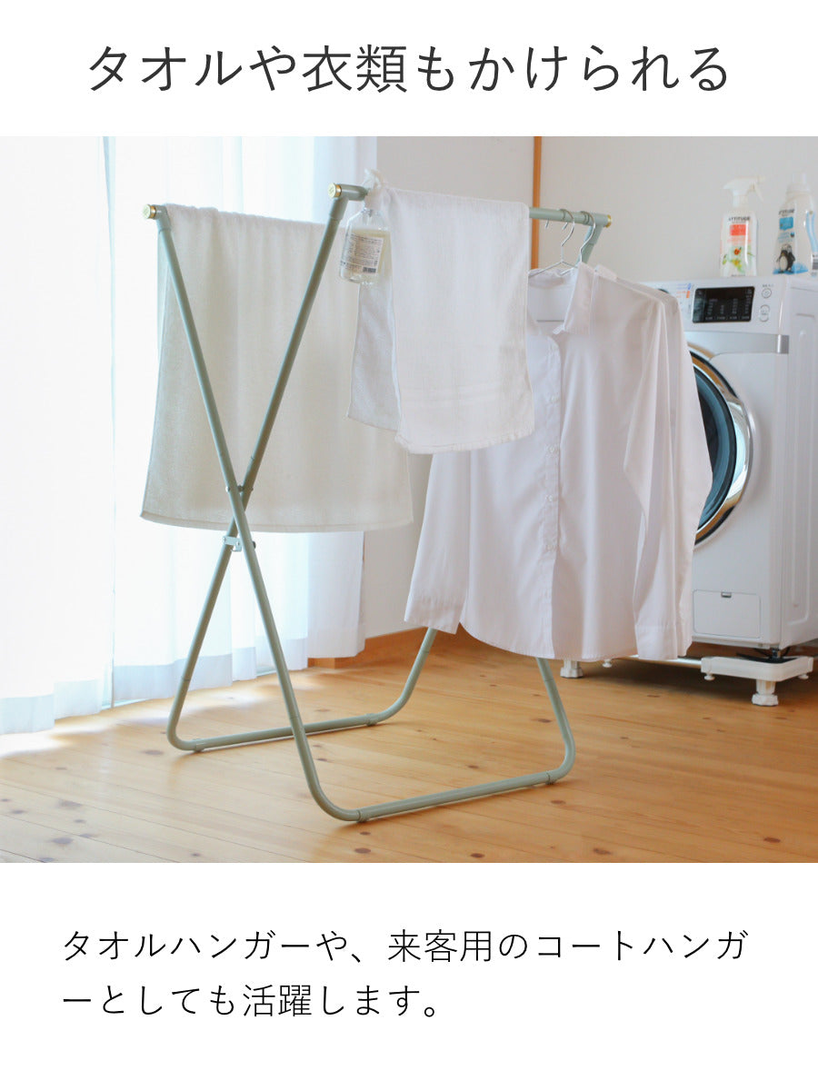少量の部屋干しをするためのタオルハンガーの代用ができるほか、来客用のコートハンガーとしても活躍します。ファブリックスプレーも一緒にかけておけば、ニオイが気になった時にパッと手に取って衣類をケアできます。